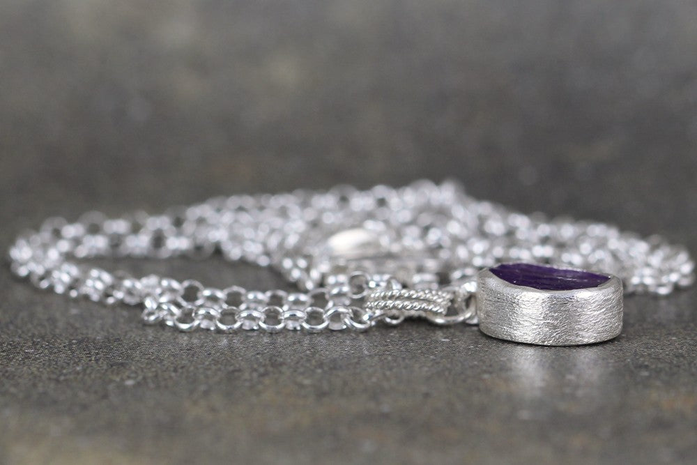 Raw, uncut, rough Amethyst is bezel set in textured sterling silver on this pendant. The pendant is topped by three twisted rings creating a unique connection to the rolo style chain it drops from. The pendant measures approximately 19mm from the top of the twist ring bail to the bottom of the setting and approximately 9mm in width. The chain is approximately 18" (45cm) in length, approximatley 2.8mm in width. The chain closes with a lobster style clasp.