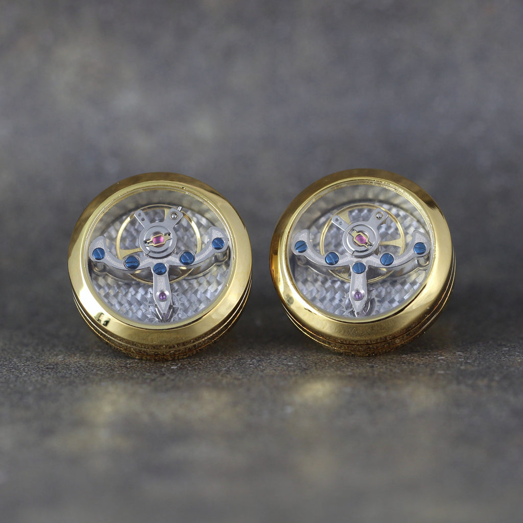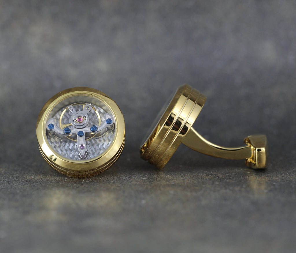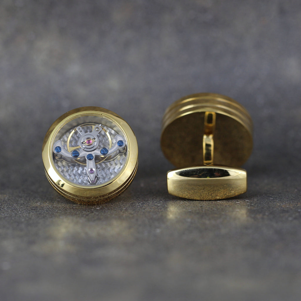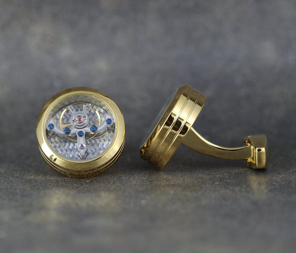 Stylish addition to men's shirt cuffs and a tribute to watchmaking, these cufflinks are styled in 'tourbillion' fashion.   Encased in gold plated steel, layered on carbon fiber texture, these mechanical movements move with the each movement of the wearer.  The tourbillion style movement is covered with glass similar to that of a watch case.   These cufflinks measure approximately 20mm in diameter and approximately 7mm in depth.