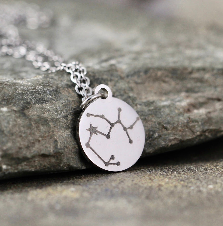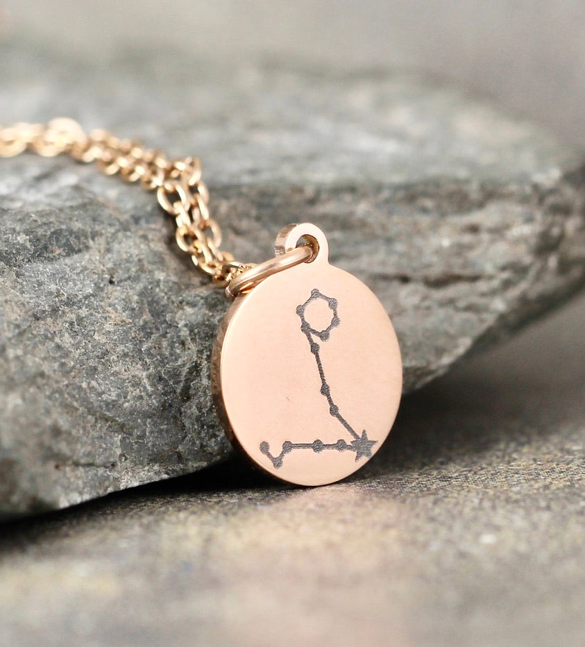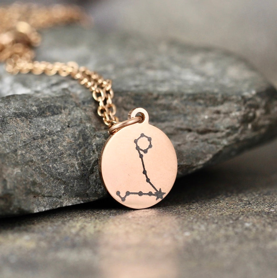 Personalized with your zodiac celestial sign  and made just for you.  Available in your choice of rose, yellow or white stainless steel.   Each dainty pendant measures approximately 12mm in diameter (approximately 1/2 inch) and hangs from a coordinating 18" stainless steel chain.    The last photos in this listing are to give you a visual representation of how this style will look when you wear it.