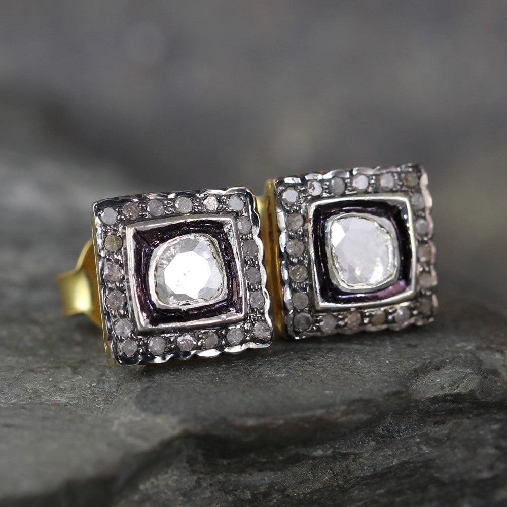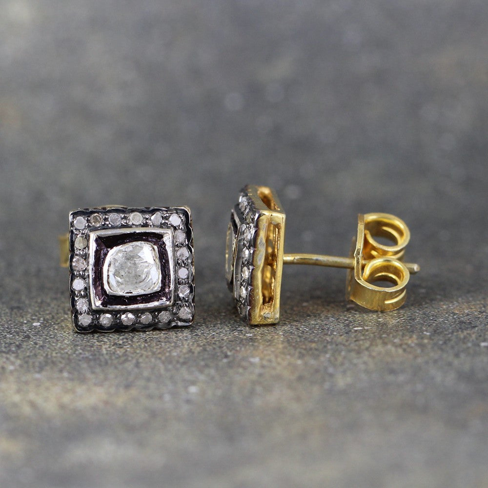 Modern with a vintage flair, these square cluster diamond set earrings are set with genuine diamond slices and rough diamonds.  The aged patina finish on the sterling silver vermeil (gold plated) settings accents the rustic style.  The earrings measure approximately 11mm x 11mm (approximately ½ inch) and are set with a total weight of approximately 1 carat rustic cut diamonds.  The post style stud earrings come complete with push on tension style backs.