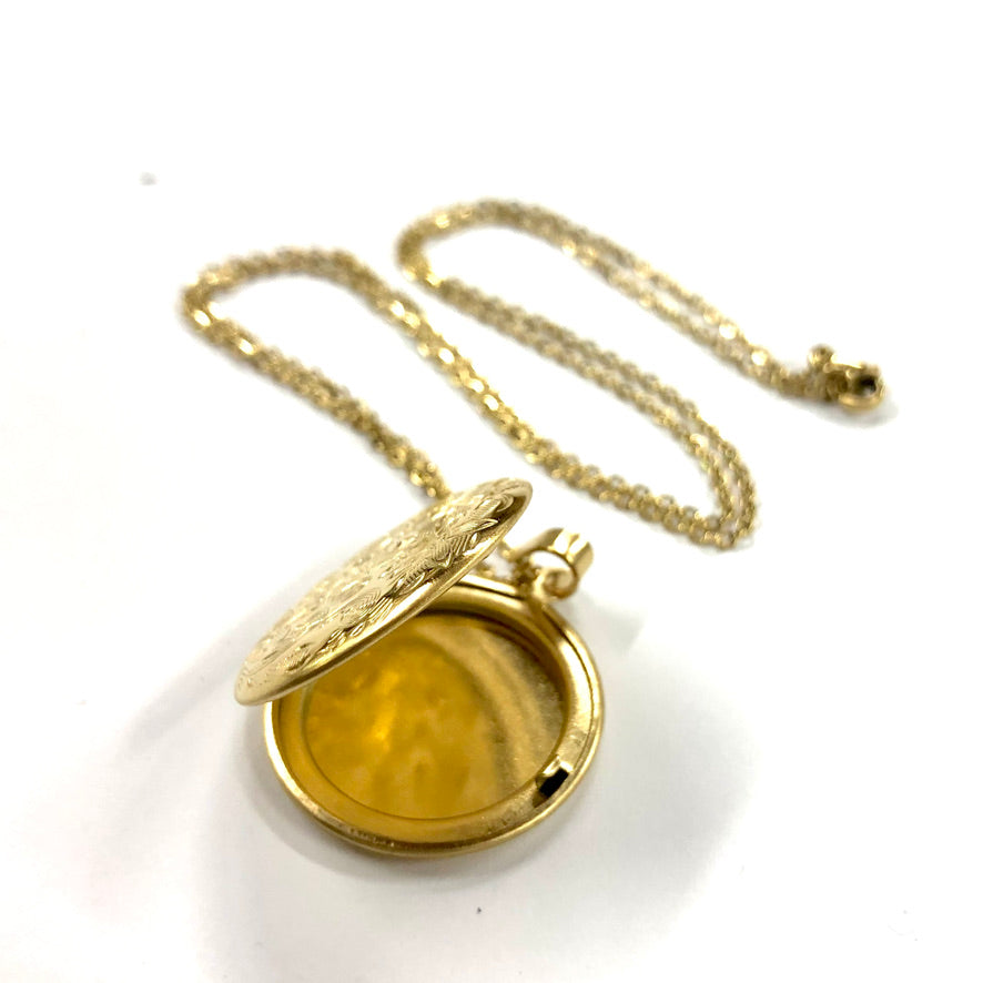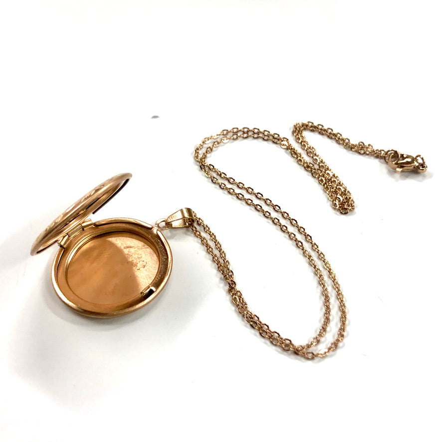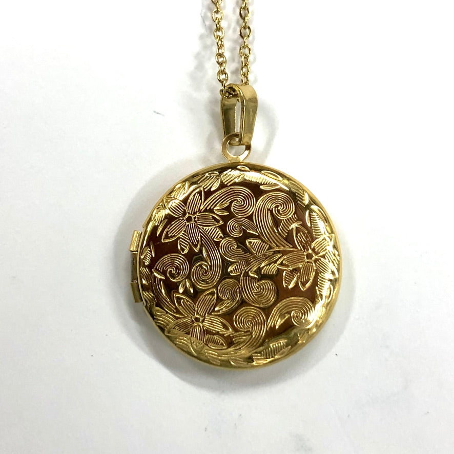 This beautiful round locket is adorned on the front with a floral motif and opens to hold photos or memories. The round locket is made in stainless steel and is available in your choice of rose, yellow or white. It measures approximately 1” (2.5cm) in diameter and hangs from a coordinating stainless steel chain approximately 20” in length.