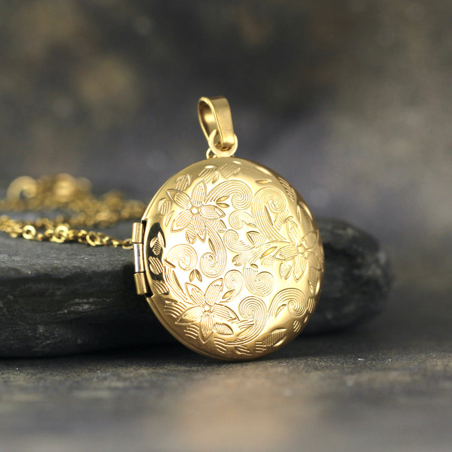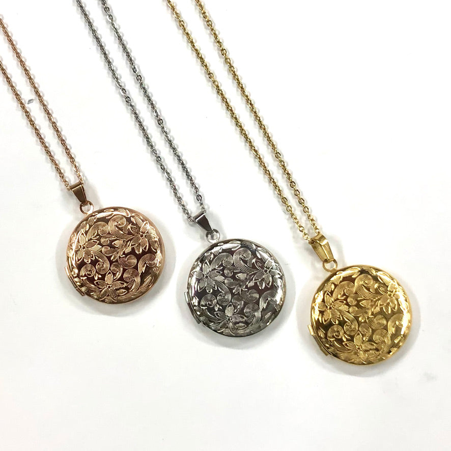 Round Stainless Steel Engraved Locket - Rose, Yellow or Silver - Hinged Locket with Floral Design - Memory Keepers
