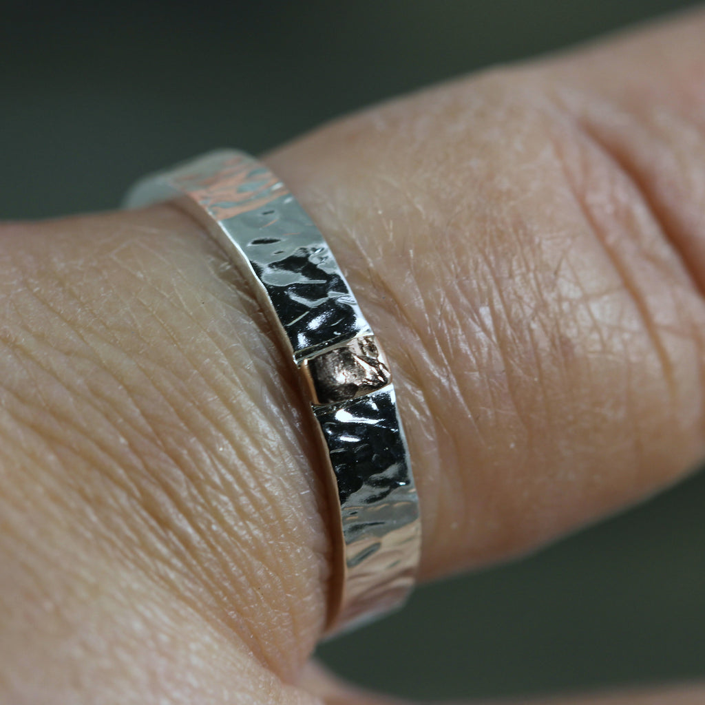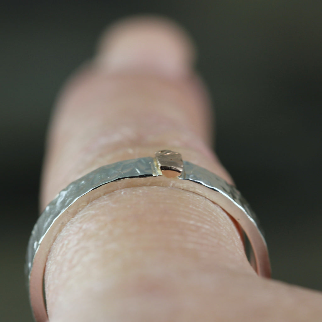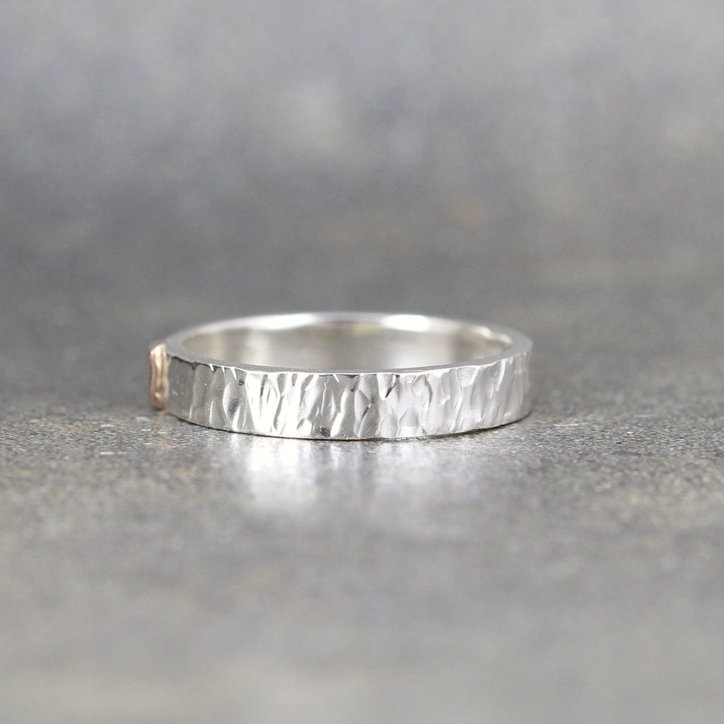 Completely handmade in my studio, this unisex ring would be perfect to celebrate your friendship, love, commitment or anniversary. The flat pipe style band is handmade from sterling silver and accented with a bar of 14K gold in your chosen color that measures approximately 1.5 mm across. The band measures approximately 4mm in width. The band is finished with a hammered rustic texture and polished to a shine. Each ring will be hand made to order to your specific finger size so there will be subtle differences from piece to piece. Be assured that although yours may differ slightly from these photos it will be equally as stunning. The last photo in this listing shows the available choices in gold accent bar.