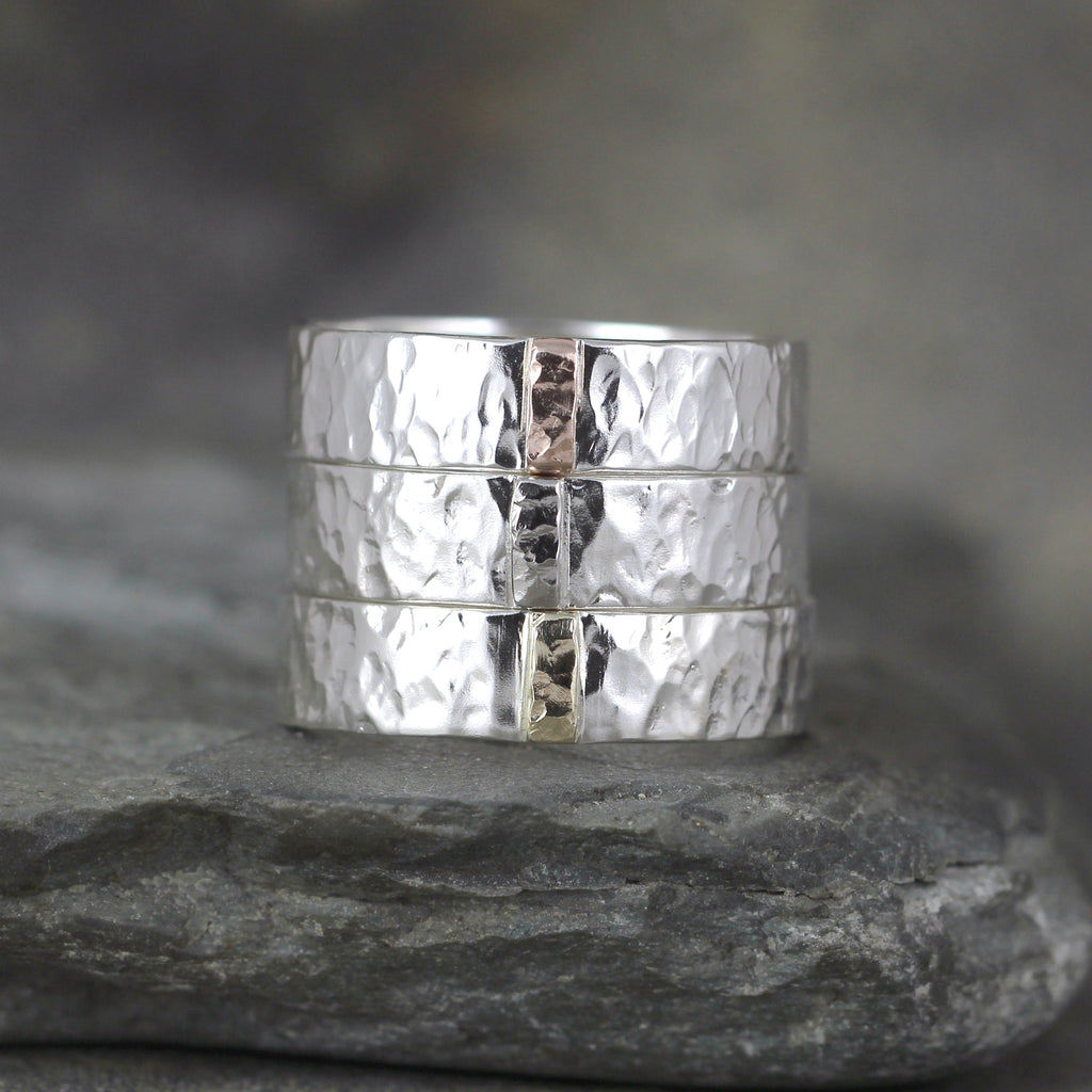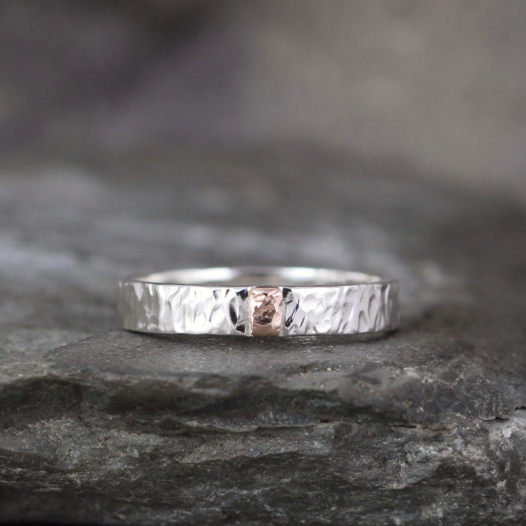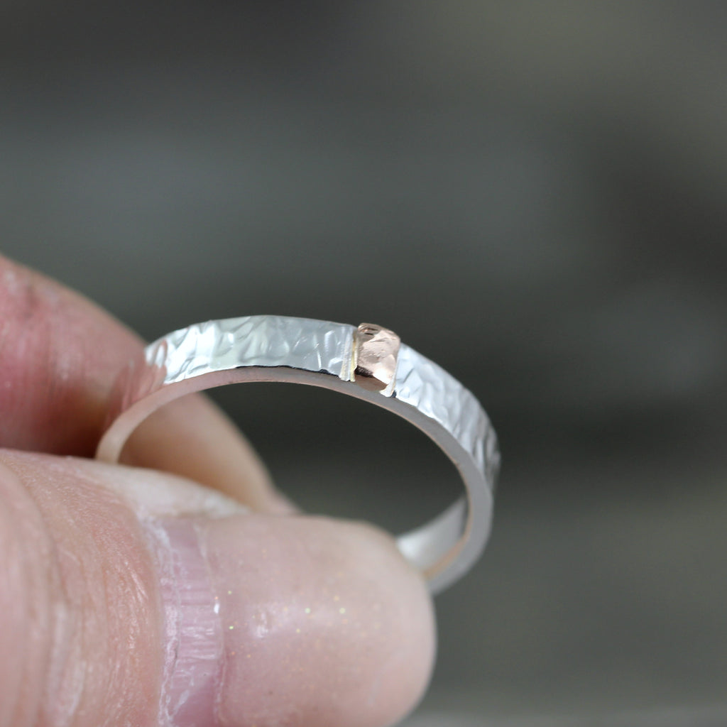 Completely handmade in my studio, this unisex ring would be perfect to celebrate your friendship, love, commitment or anniversary. The flat pipe style band is handmade from sterling silver and accented with a bar of 14K gold in your chosen color that measures approximately 1.5 mm across. The band measures approximately 4mm in width. The band is finished with a hammered rustic texture and polished to a shine. Each ring will be hand made to order to your specific finger size so there will be subtle differences from piece to piece. Be assured that although yours may differ slightly from these photos it will be equally as stunning. The last photo in this listing shows the available choices in gold accent bar.