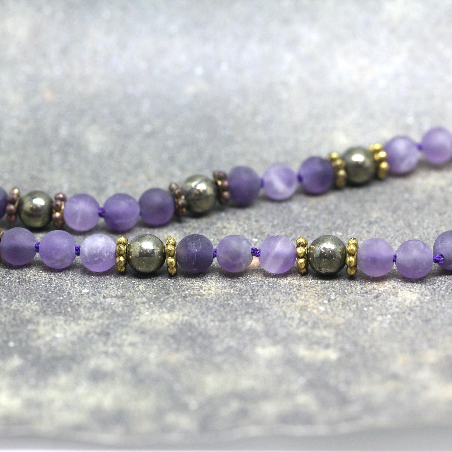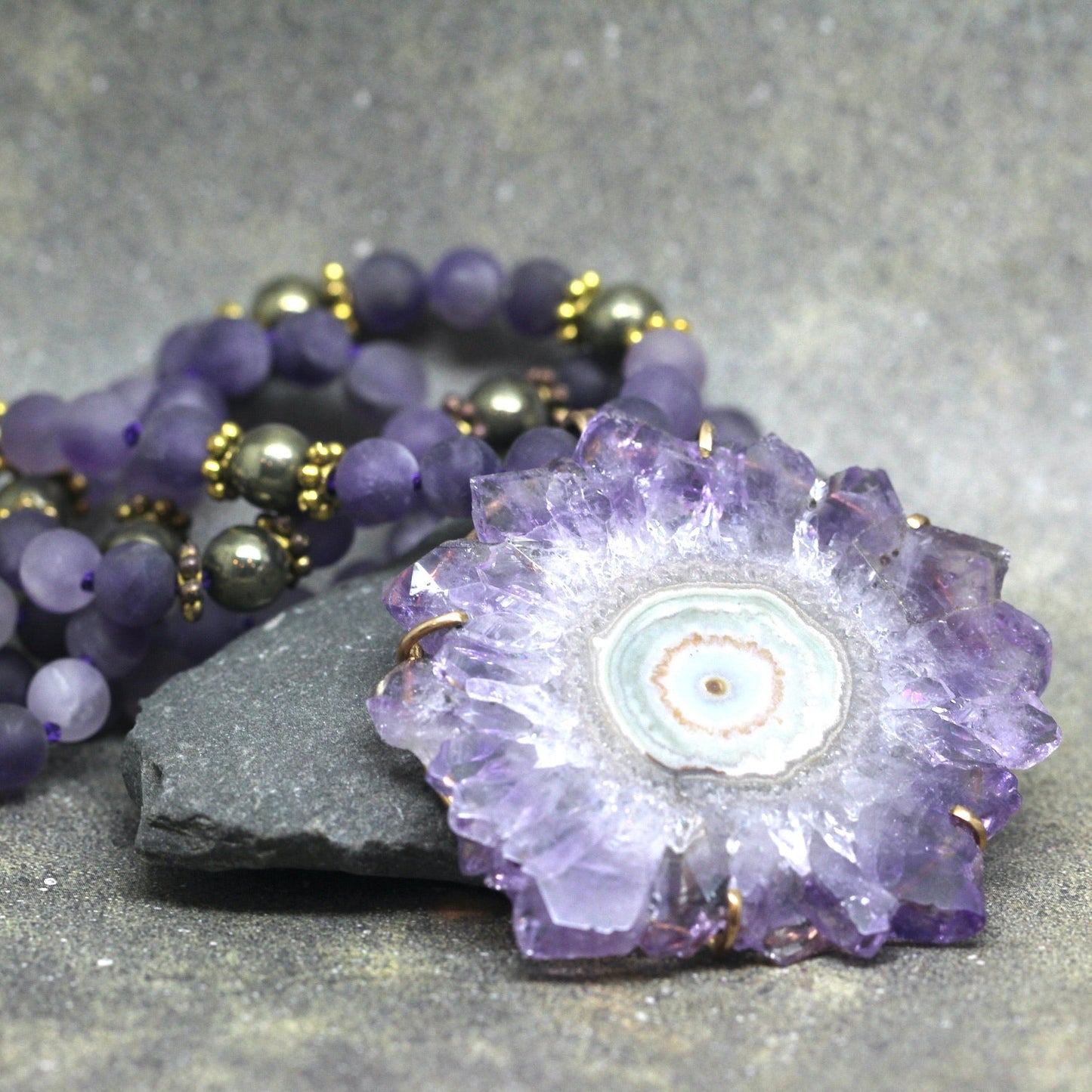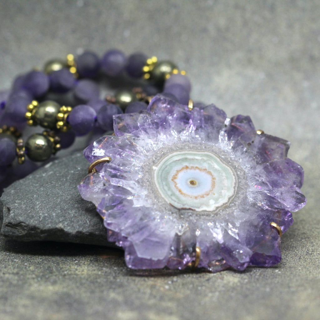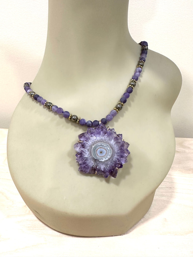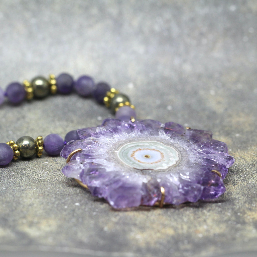 An amethyst slice is the focal piece on this beaded necklace of matte amethyst beads with stations of pyrite. Hand beaded and with individual knots, this stunning statement necklace will be a showstopper and conversation starter each time you wear it. The genuine, natural amethyst beads have a matte, frosted finish and each measure approximately 6mm in diameter. Stations of brass and pyrite beads add interest to this design. The beaded necklace measures approximately 19.5" in length and closes easily with a lobster style clasp. The amethyst slice is almost 2" in diameter (a the widest) and is set in a handmade brass setting. This one of a kind necklace is designed and handmade in my workshop in Calgary, AB.