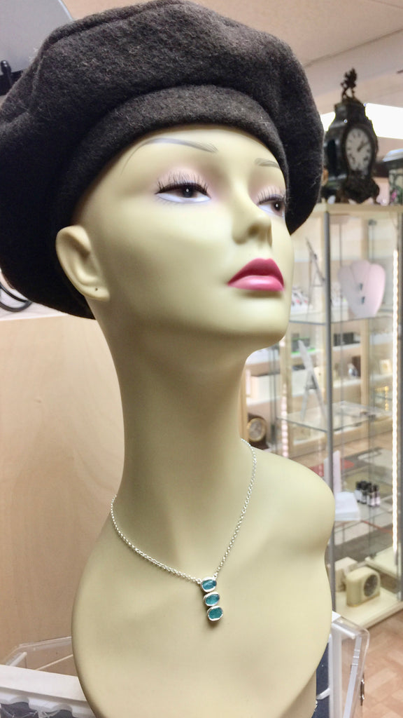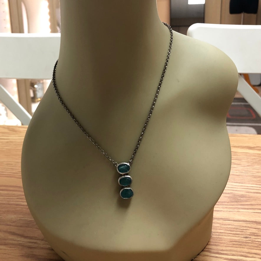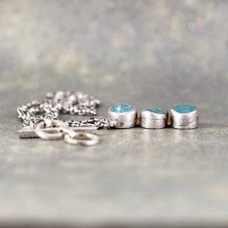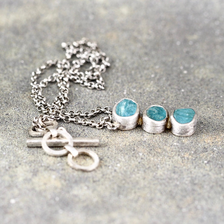A trio of rough, raw, uncut Apatite gemstones are set in textured sterling silver bezel setting on this one of a kind necklace. The gemstones drop in a line from rolo link sterling silver chain. The trio of Apatite pendant measures approximately 25mm (approximately 1") in length x 10mm in width. The chain is approximately 2.4mm and closes with an adjustable link toggle bar. This necklace is lightly oxidized to accent the details and textures.