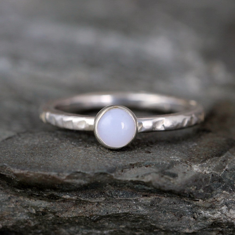 Genuine blue chalcedony gemstone set in sterling silver to stack or wear on its own. Handmade in my Calgary Alberta workshop each ring features a cabochon cut light blue chalcedony gemstone measuring approximately 5mm in diameter. My hand textured sterling silver band is approximately 2mm in width and will be sized for you to the size you select prior to shipping.