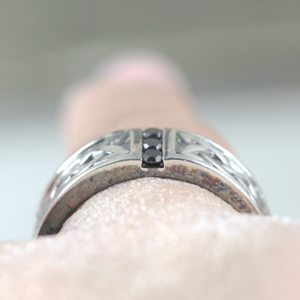 Inspired by Celtic knots, this ring is set with 3 round brilliant cut black genuine diamonds. Made in sterling silver, I've oxidized this piece to accent the design. The ring measures approximately 7.5mm width and is set with 3 diamonds weighing approximately 0.18 carat in total weight. This ring will be made to order for you in your chosen finger size. Please allow approximately 3 weeks for me to make this for you.