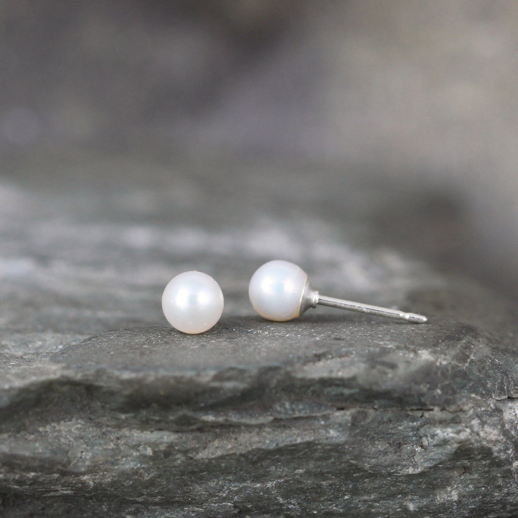 Classic stud style pearl earrings, featuring 4mm white, round, freshwater pearls. Each pearl is set in a sterling silver cup and post style pierced earring. Included with these pearl stud earrings are sterling silver push on butterfly backs.