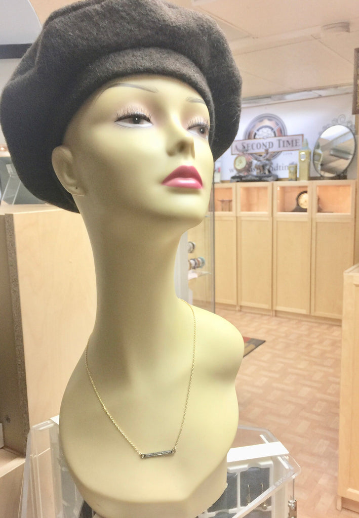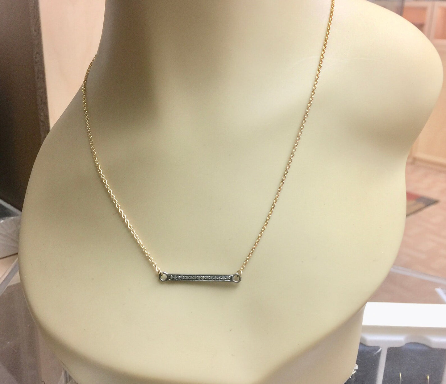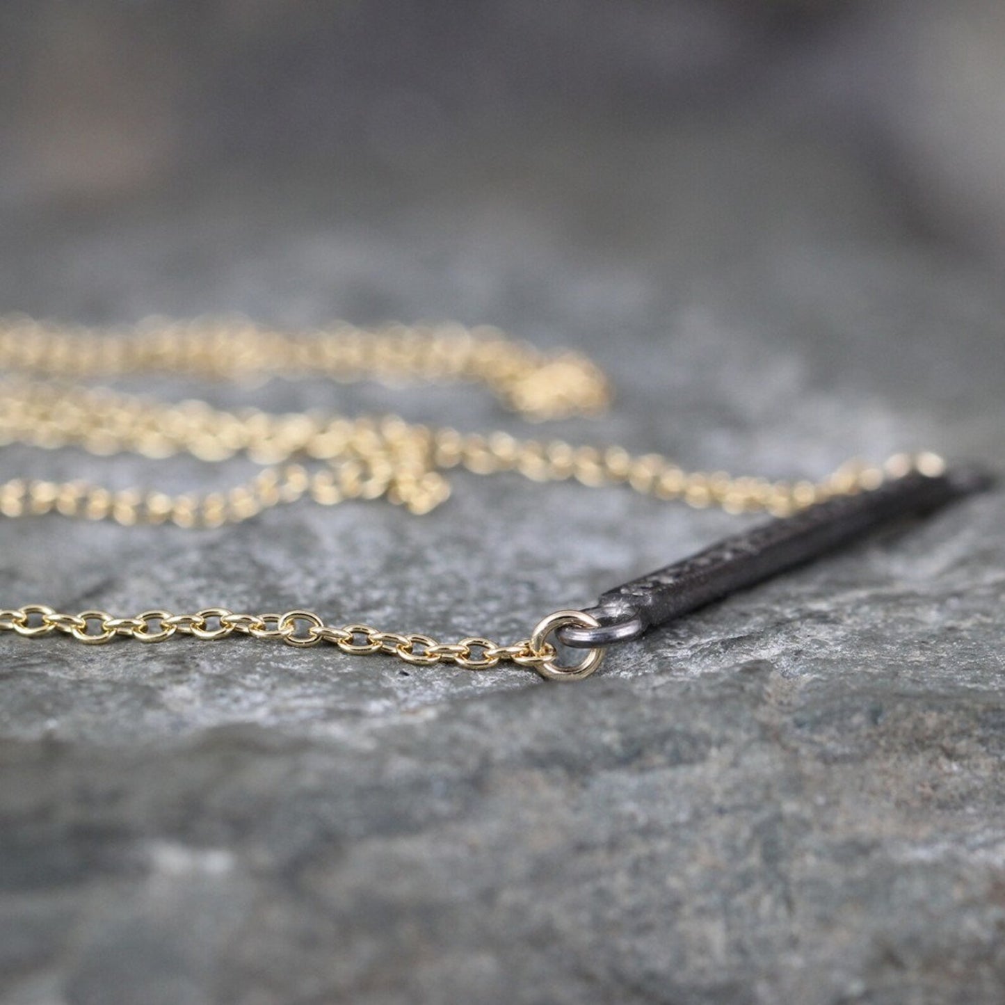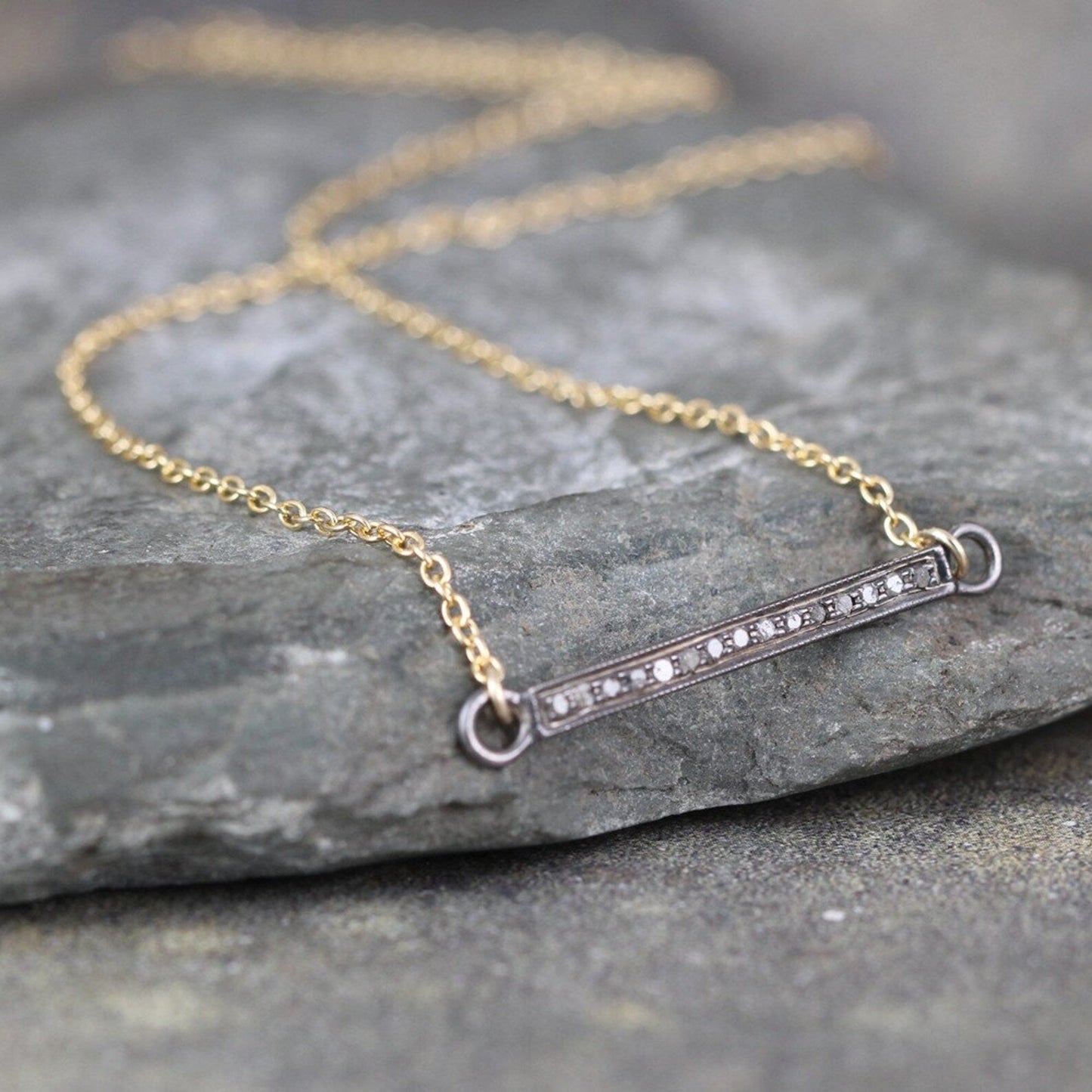 Set with genuine rough cut diamonds, this slender bar necklace is perfectly elegant on its own or layered with others from your collection. The genuine diamonds are set in an oxidized sterling silver bar and attached to yellow gold filled cable chain that closes with a spring ring style clasp. This necklace measures approximately 19" in total length making it striking with a low cut neckline or pulled over a high collar. The sterling silver bar measures just over 1" in length and approximately 2.5 - 3mm in width. Genuine, rough cut diamonds totalling approximatley 0.20 carat are set in the oxidized bar. The mixed colors and metals nails today's trends while the classic styling makes this a timeless piece that you'll find yourself wearing for years to come.