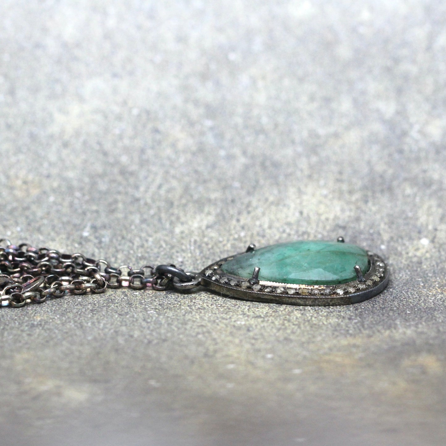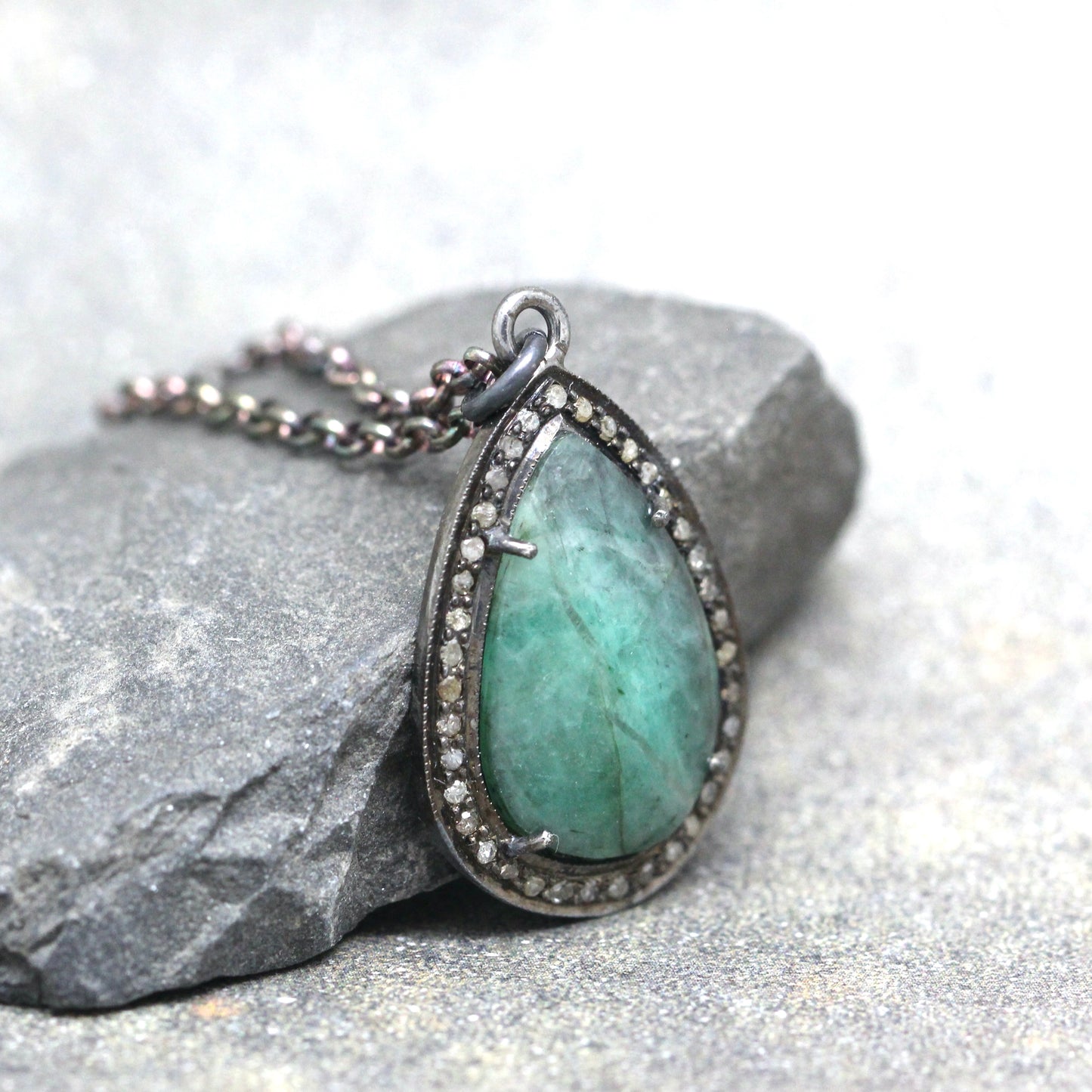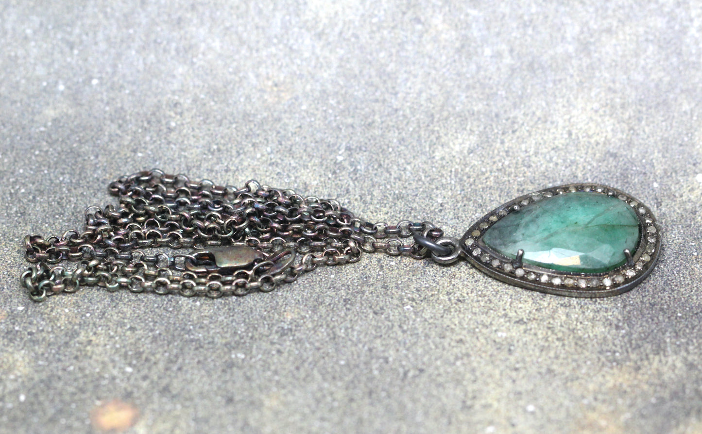 This halo style Emerald pendant is set in oxidized sterling silver and accented with rough faceted diamonds. The rose cut, teardrop shape emerald measures approximately 18 x 12 mm in size and is surrounded by roughly faceted genuine diamonds that have a total weight of approximately 0.20 carat. The overall size of the pendant is approximately 24 x 18 mm in size (approximately 1 inch long). The emerald has dark and light veining commonly found in natural, earth mined emerald. This pendant hangs from a sturdy 3mm rolo link sterling silver chain measuring approximately 18 inches in length. The chain closes with a lobster style clasp. This necklace is perfect to layer or wear on its own.