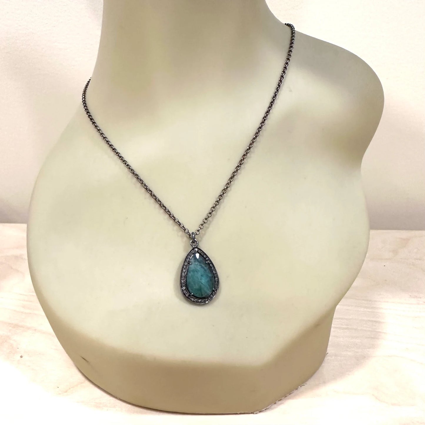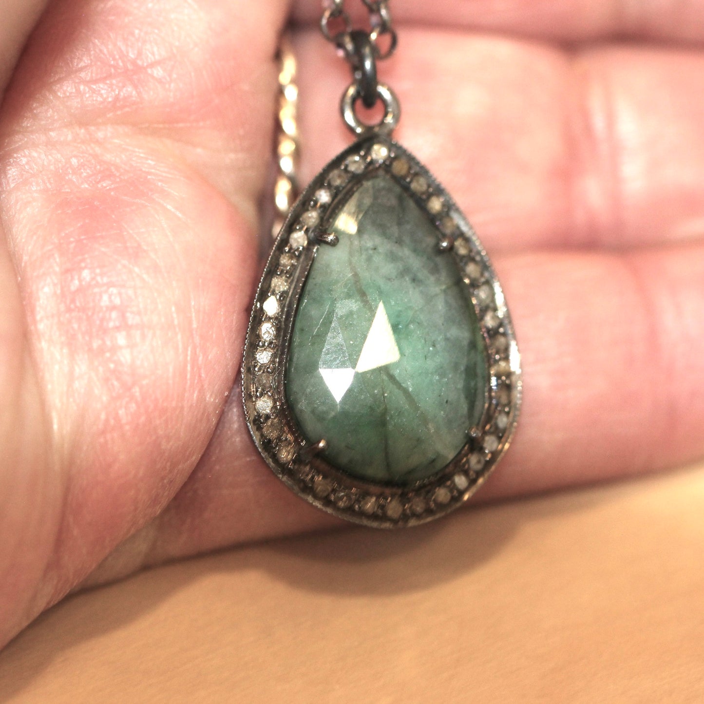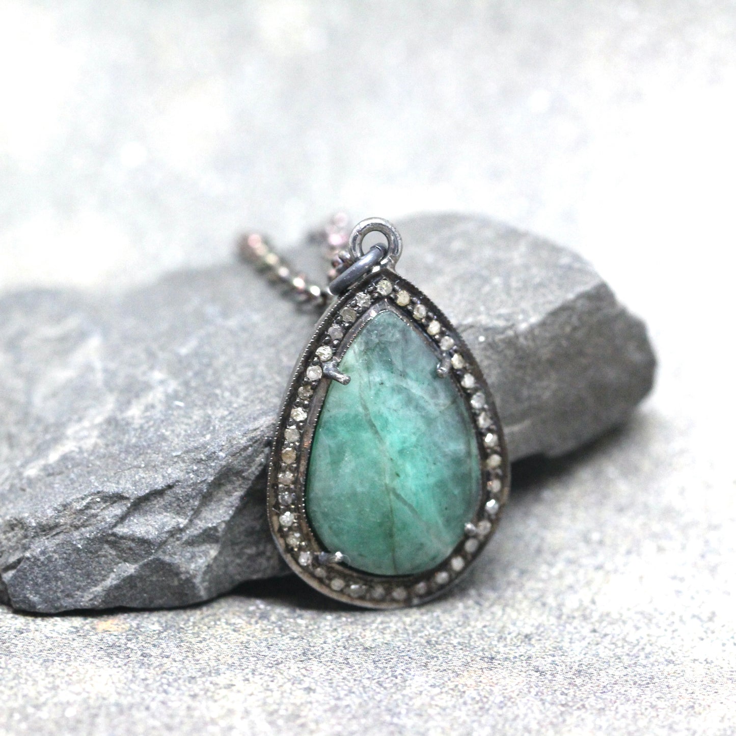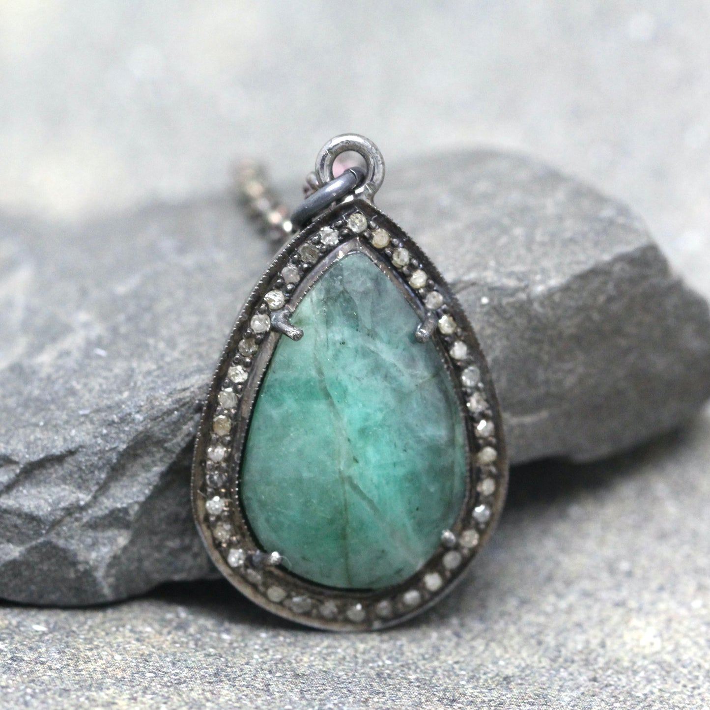 This halo style Emerald pendant is set in oxidized sterling silver and accented with rough faceted diamonds. The rose cut, teardrop shape emerald measures approximately 18 x 12 mm in size and is surrounded by roughly faceted genuine diamonds that have a total weight of approximately 0.20 carat. The overall size of the pendant is approximately 24 x 18 mm in size (approximately 1 inch long). The emerald has dark and light veining commonly found in natural, earth mined emerald. This pendant hangs from a sturdy 3mm rolo link sterling silver chain measuring approximately 18 inches in length. The chain closes with a lobster style clasp. This necklace is perfect to layer or wear on its own.