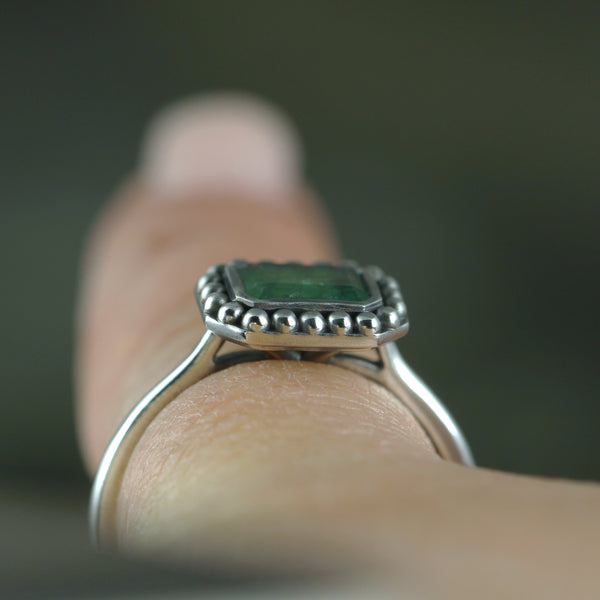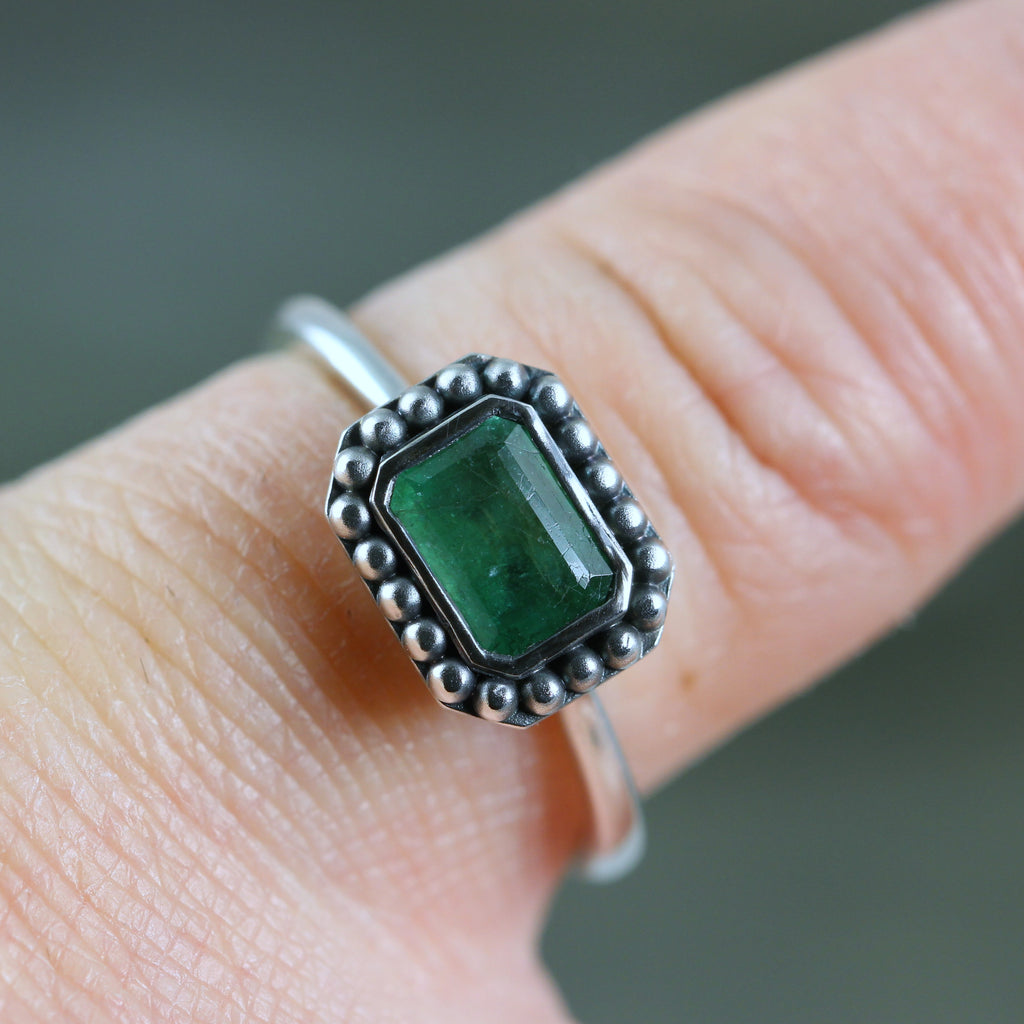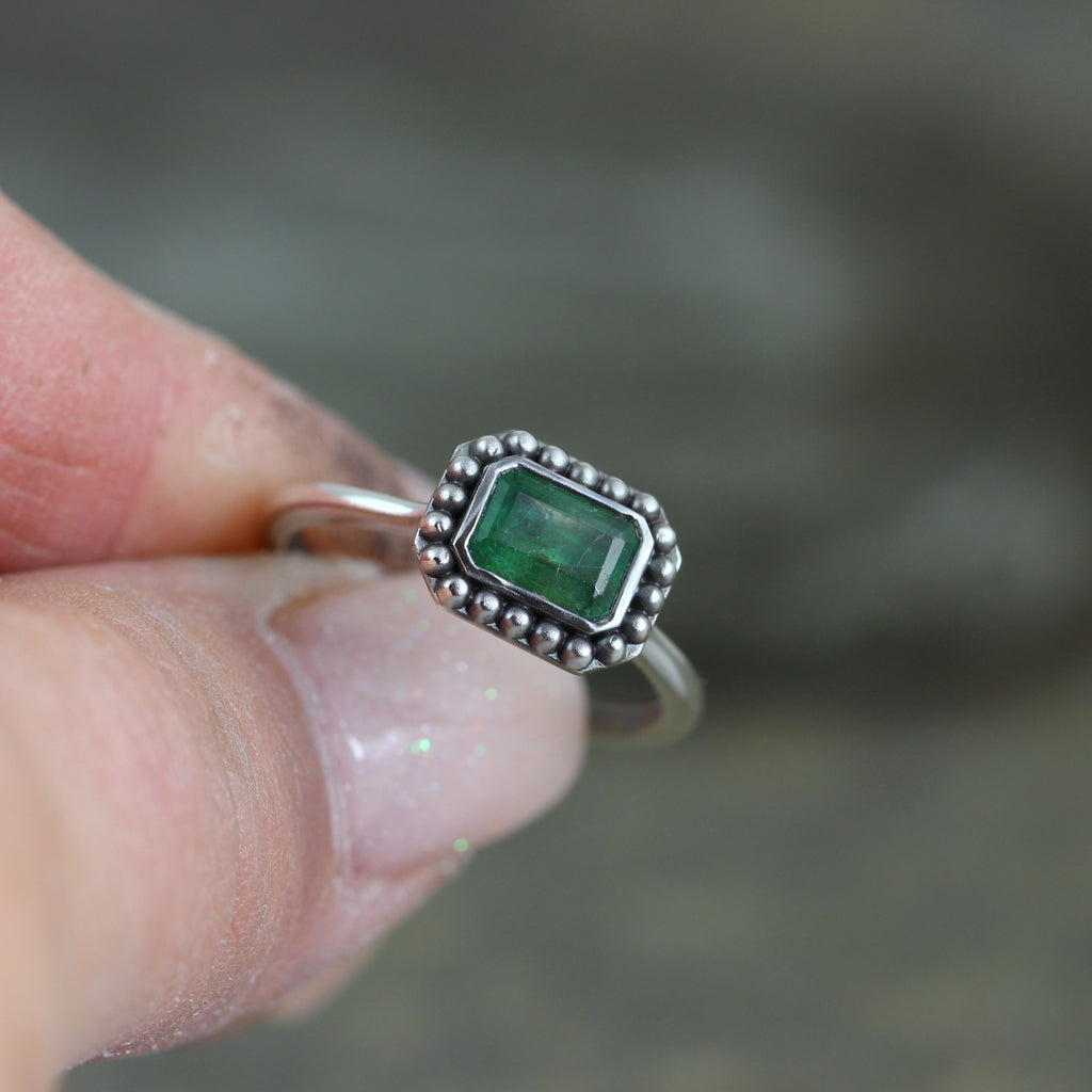 Delicate beaded detailing surrounds a vibrant green emerald. This ring is made in sterling silver and oxidized lightly to accent the detailed textures. The emerald cut emerald measures approximately 6 x 4mm and is a AA quality. The overall size of the top of the ring is approximately 10.5 x 8.5 mm. The width of the band is approximately 1.5mm.