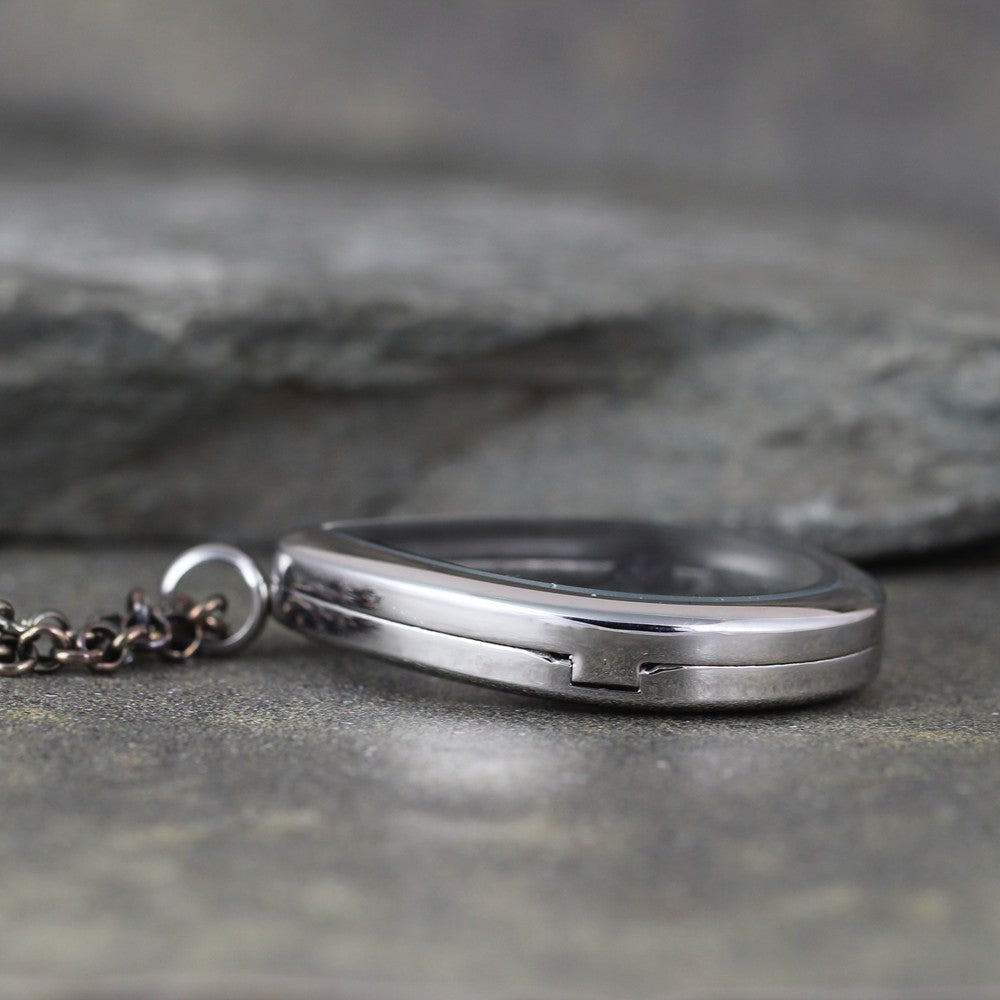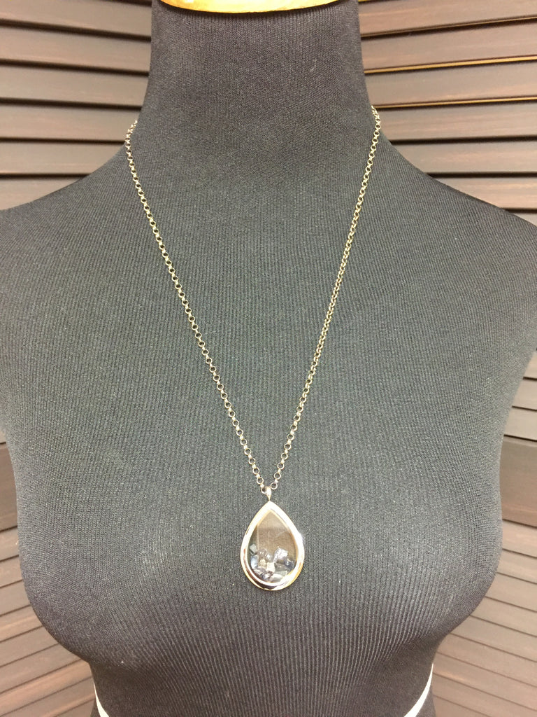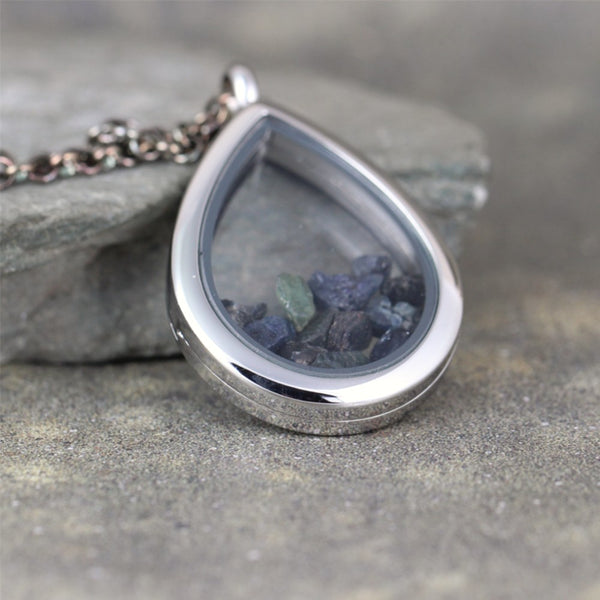 Enclosed in glass are genuine specimens of sapphire in varying tones of blue ranging from denim blue to midnight blue. This unique glass double sided pendant is framed in stainless steel and sealed to keep the free floating sapphires secure in the locket. The pendant measures approximately 4 cm in length from the top of the bail to the bottom of the pendant and approximately 3 cm in width at the widest point. The glass sided locket hangs from a 24" long chain of oxidized sterling silver. The chain closes with a lobster style clasp. This pendant is perfect for layering with others from your collection or to wear on its own.