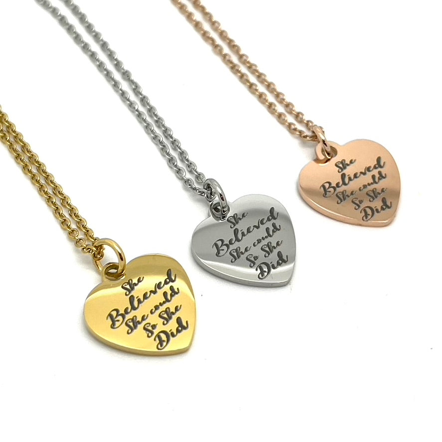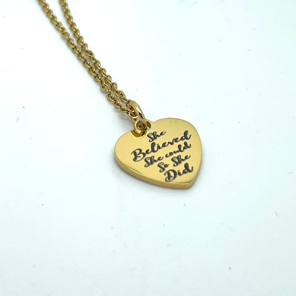 This inspirational quote is the perfect way to encourage your loved ones to keep reaching for their dreams. This beautiful stainless steel heart pendant is laser engraved with the inspiring words, "She Believed She Could So She Did” and is a lovely reminder to stay positive and motivated. This pendant is laser engraved in my Calgary, AB workshop and comes with an 18” (45cm) coordinating chain with lobster clasp closure. The heart shape pendant measures just over 1/2” (16mm). Choose from rose, yellow or white tone to suit your personal style.