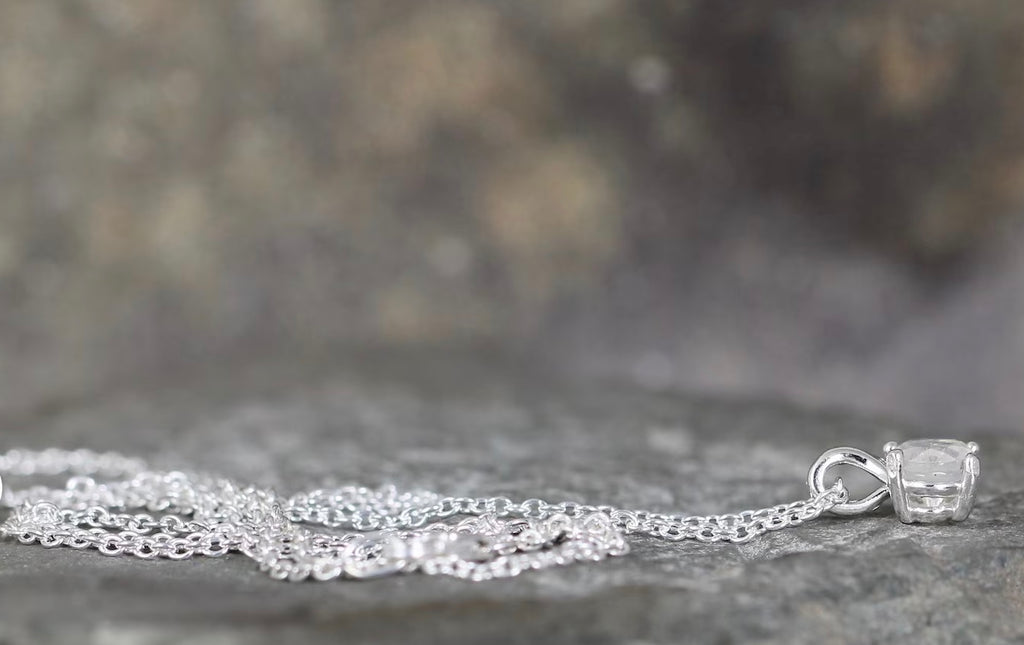 Genuine moonstone set in a sterling silver pendant setting. This pendant has the moonstone sitting horizontal, a nice departure from the many that are typically set vertical. The bail holding the chain is stylized in a flourish adding extra visual impact. The moonstone measures approximately 7 x 5mm. The overall size of the pendant is approximately 10mm from top of bail to bottom of stone and approximate 6.75 mm in width. Included with this pendant is a dainty curb link chain approximately 1.5mm in width that closes securely with a lobster claw clasp. This pendant will be shipped to you in a presentation box ready for gift giving!