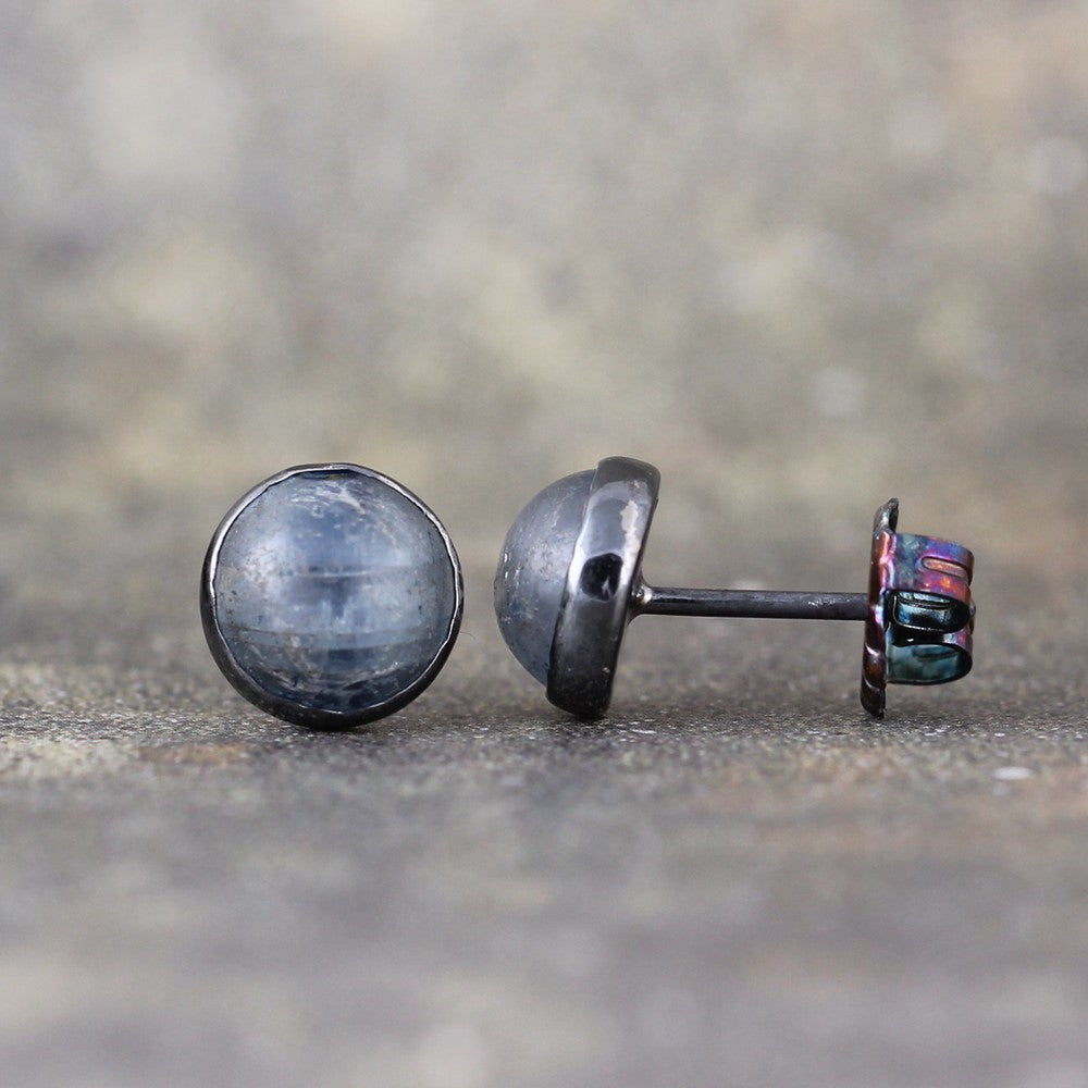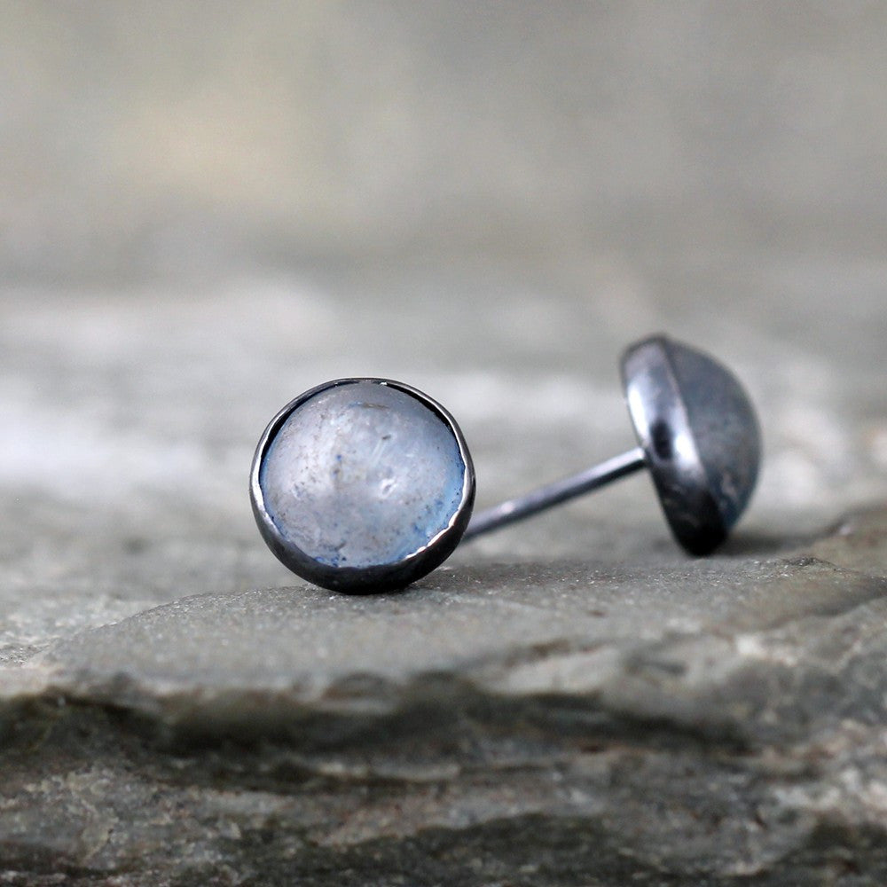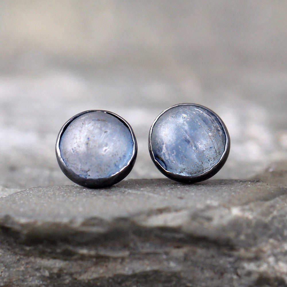 Genuine denim blue Kyanite gems are fashioned with a rounded, yet rough and rustic top and set in sterling silver bezel settings created specifically for each stone. A dark oxidized patina accents the rustic vibe of these earrings. These sterling silver post style earrings measure approximately 8 mm in diameter and come with push on style butterfly backs. Each pair is handmade by myself in my studio/workshop in Calgary, Alberta, Canada.