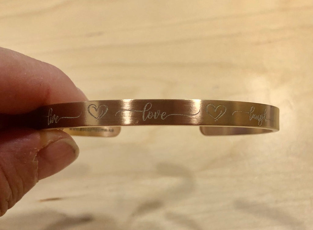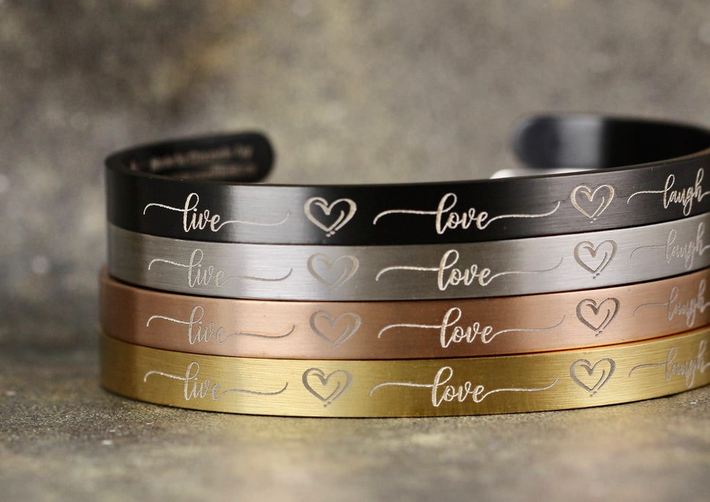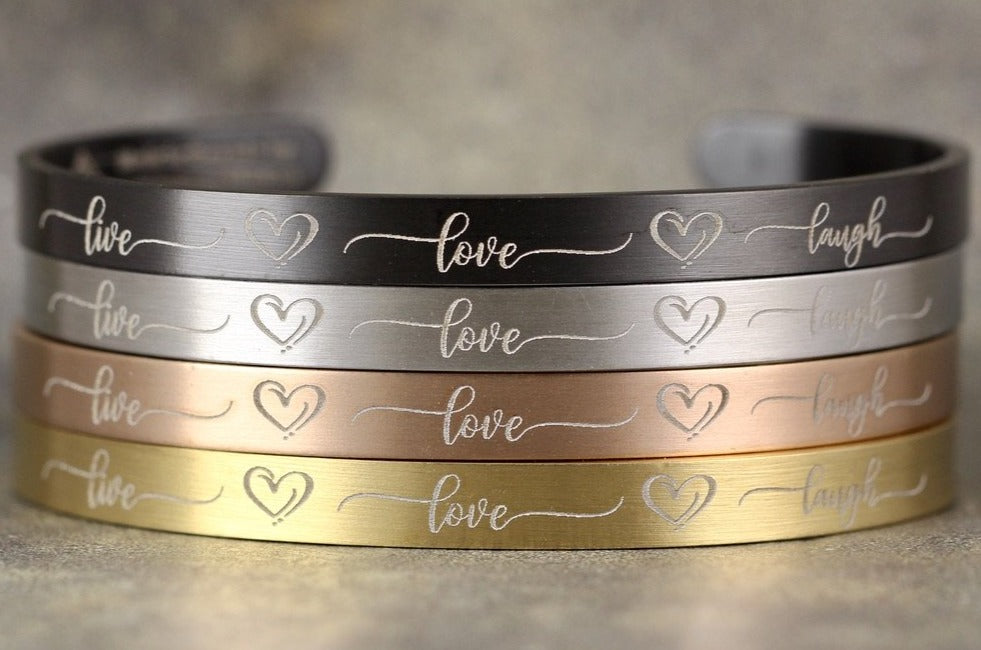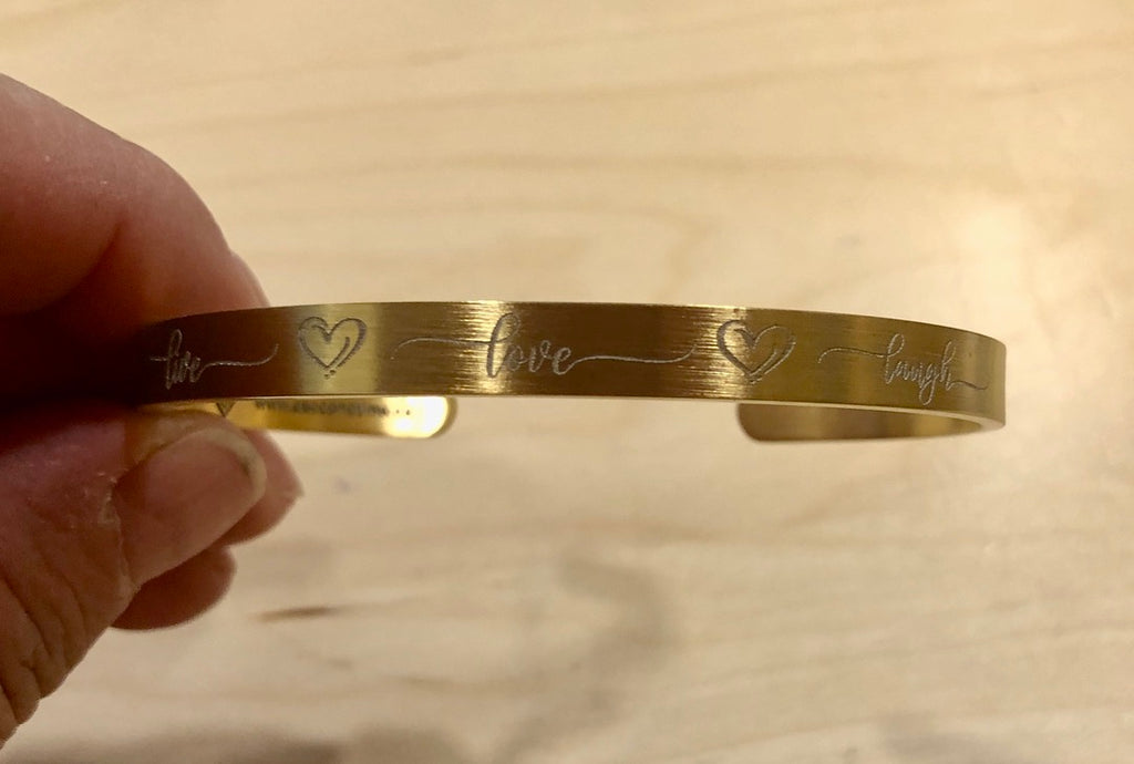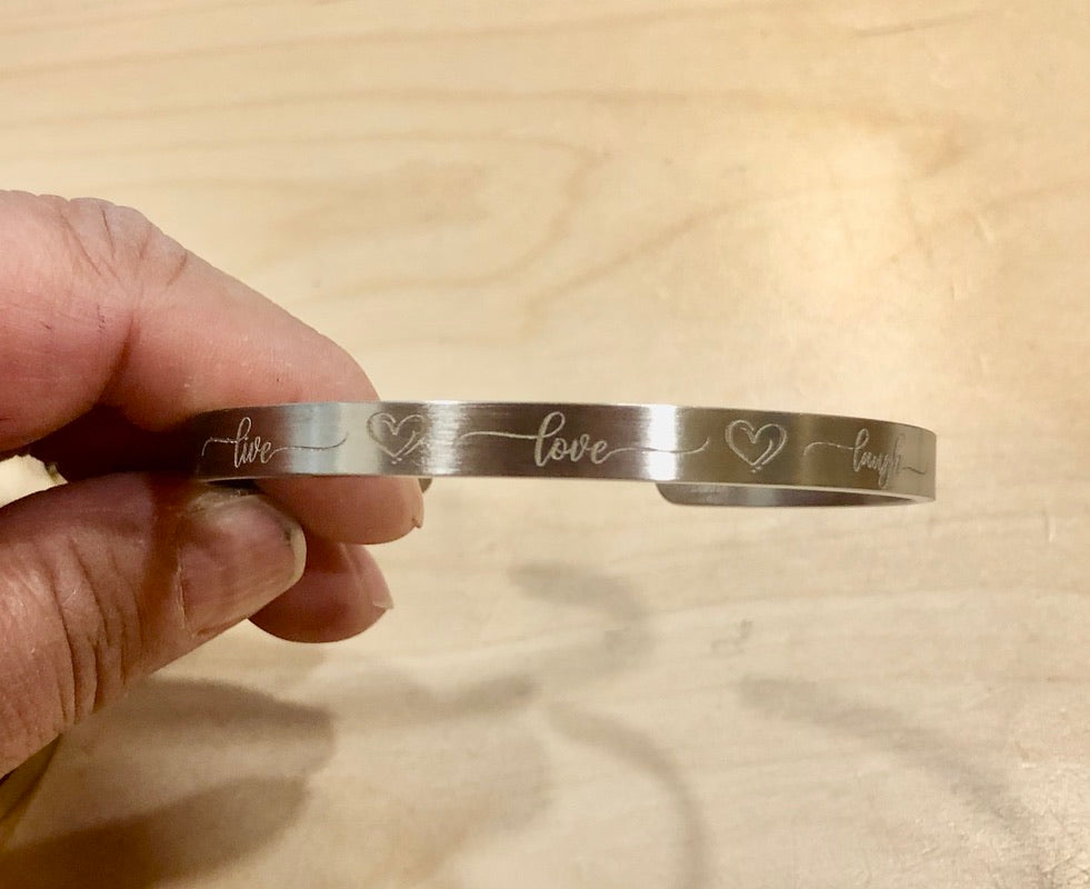 Stainless steel cuff bracelet, deep laser engraved with live, love, laugh and hearts in fancy script