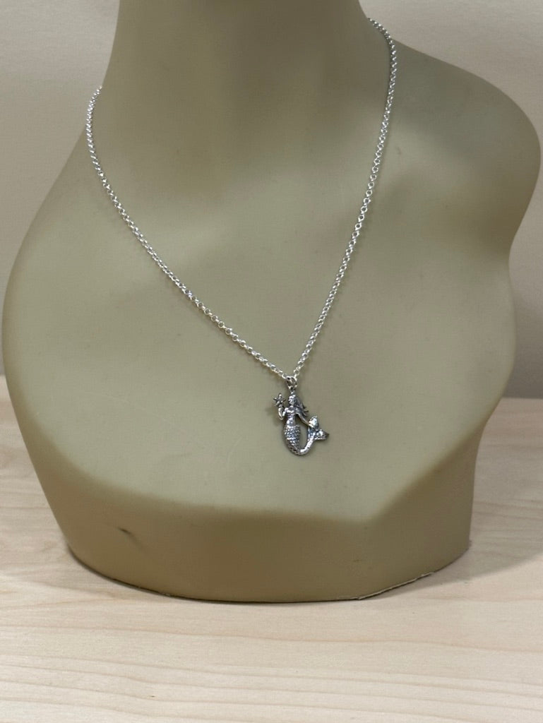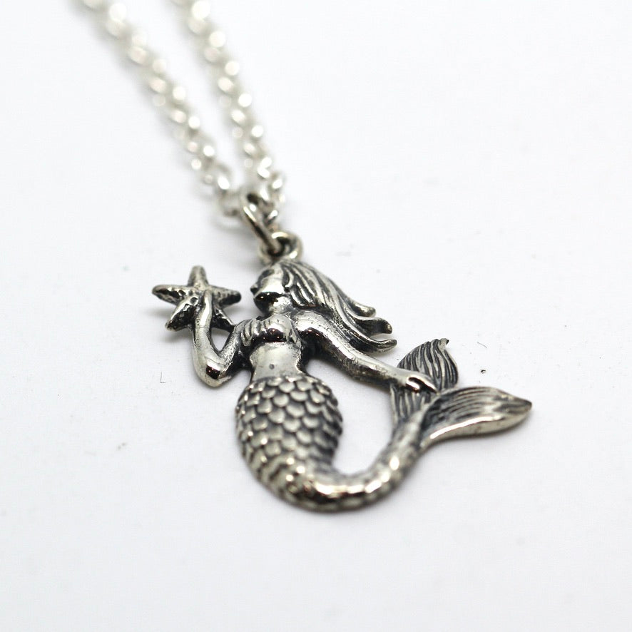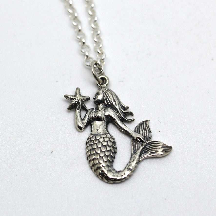 Mystical and magical, this Mermaid pendant is the symbol of dreams and fantasy. Made entirely in sterling silver, the mermaid pendant measures approximately 24mm in length and hangs from a sterling silver rolo link chain approximately 3mm in width and approximately 18" (45cm) in length. The chain closes securely with a lobster style clasp. The pendant has been oxidized to accent the details of this piece.