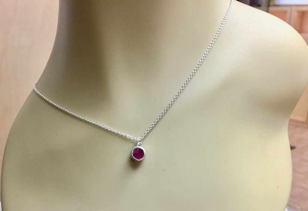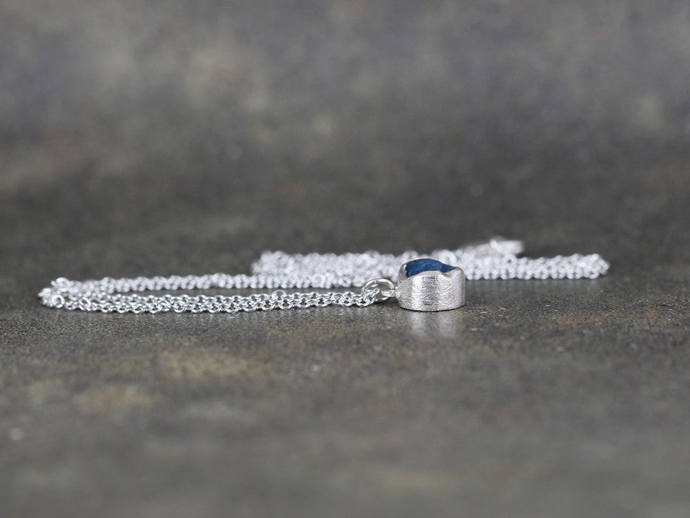 Stunning neon blue apatite is bezel set in sterling silver and drops from a sterling silver chain. The rough, raw, uncut apatite is natural and the way nature created it. Apatite of this color variation is sometimes referred to as 'windex blue' because of its close resemblance in color to the famous window cleaner. The pendant measures approximately 10mm from the top of the bail to the bottom of the rustic textured setting and approximately 7mm in width. The chain is approximately 18" (45cm) in length and closes with a lobster style clasp.