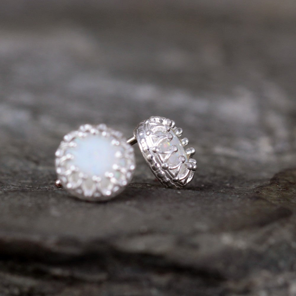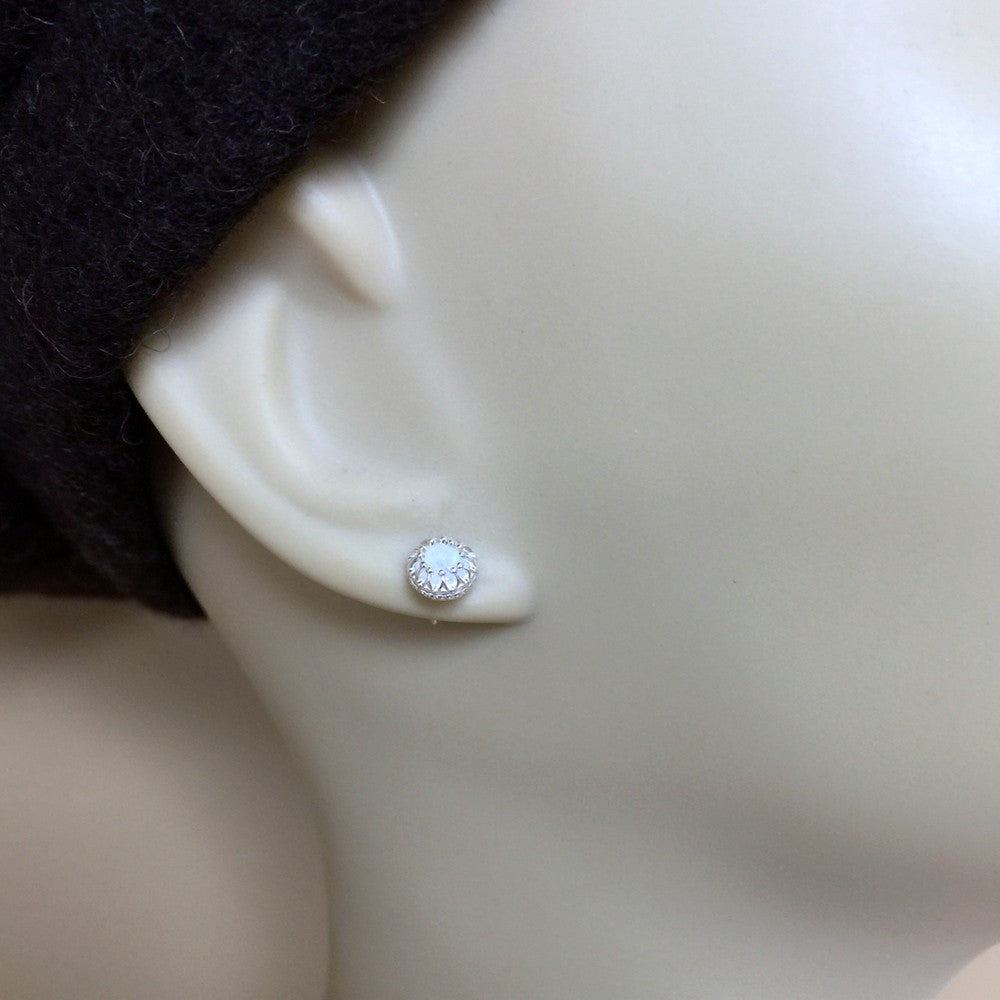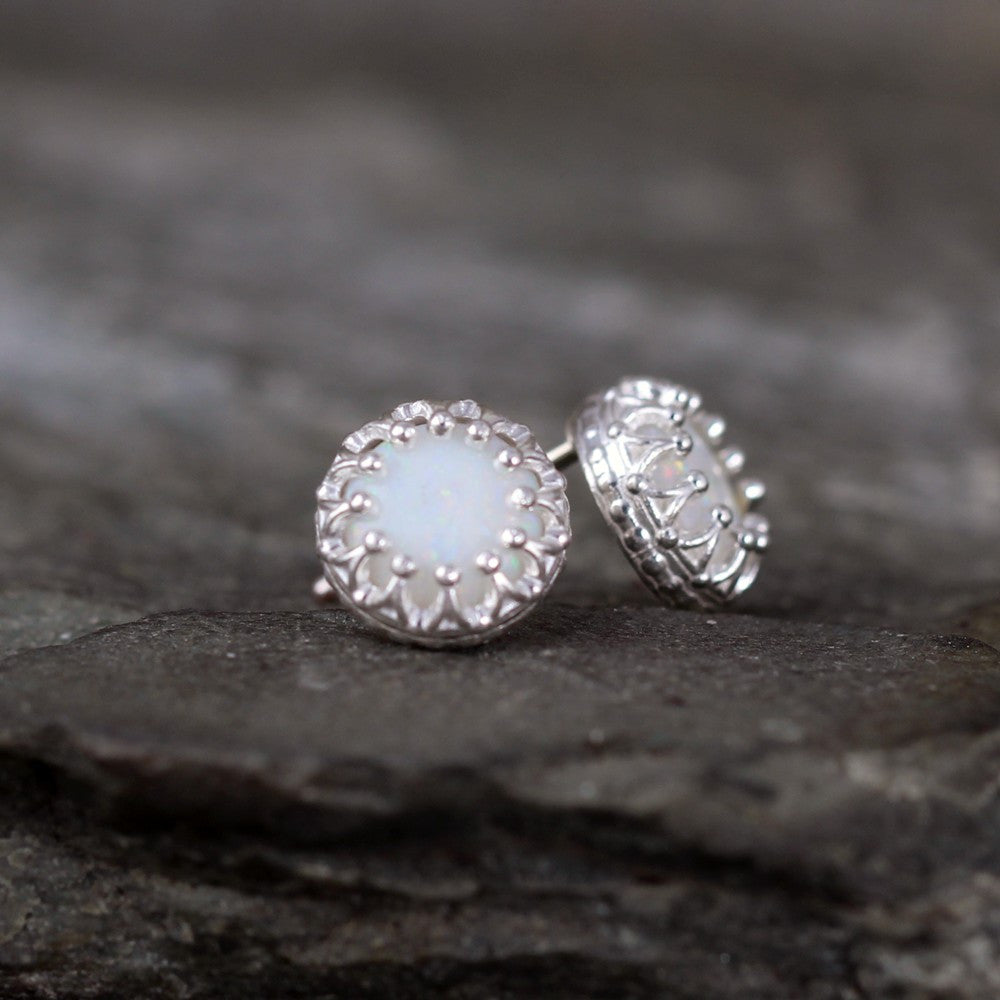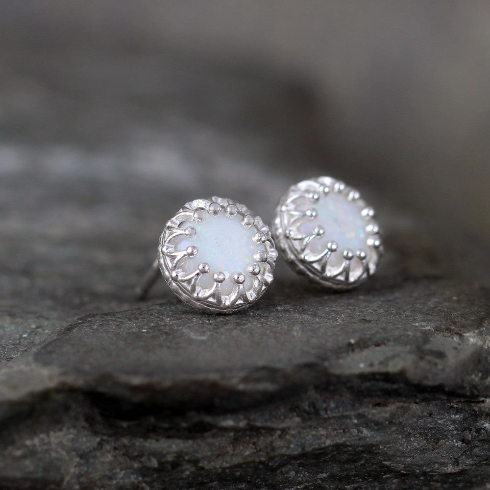 Vintage inspired sterling silver settings frame genuine opal gemstones in these stud style earrings. The crown style setting measures approximately 7 - 7.5mm in diameter and securely holds a genuine opal gemstone measuring approximately 6mm in diameter. Included with the earrings are sterling silver push on style butterfly backs.