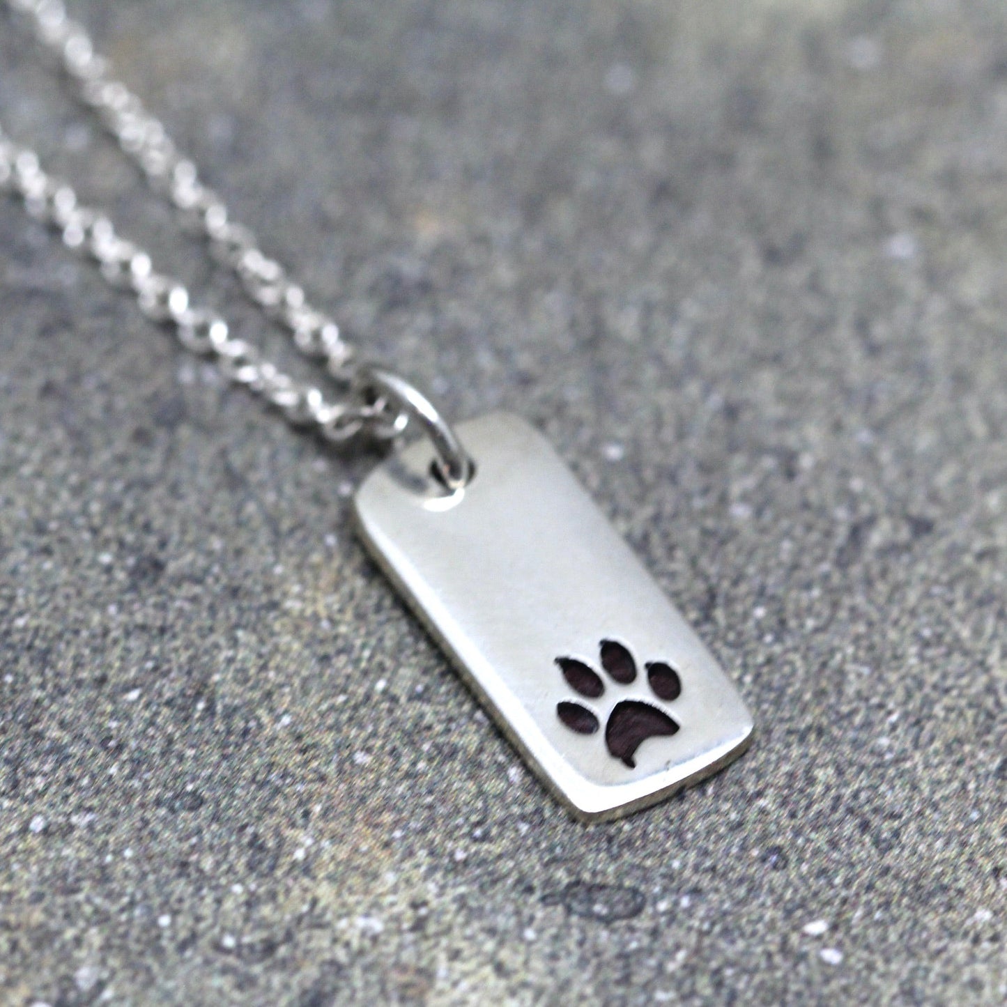 We love our pets! This dainty, rectangular shape pendant has a tiny paw print accent. The pendant measures approximately 12 mm (approximately 1/2 inch) in size and hangs from a sterling silver chain approximately 1.2mm in width and approximately 18" (45cm) in length. The chain closes securely with a lobster style clasp.