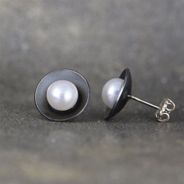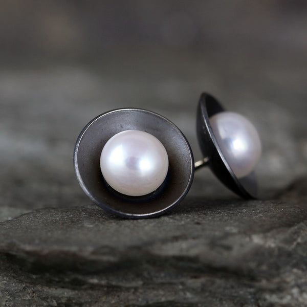 These modern designed, fresh water pearl earrings are handmade in my studio. The white fresh water pearl is cupped in a sterling silver modern stud earring setting. The sterling silver is lightly textured and oxidized. The fresh water pearl measures approximately 6mm - 6.5mm in diameter and sits in a domed cup measuring approximately 11.5mm. Included with these pearl stud earrings are sterling silver push on butterfly backs.