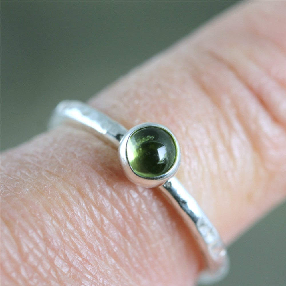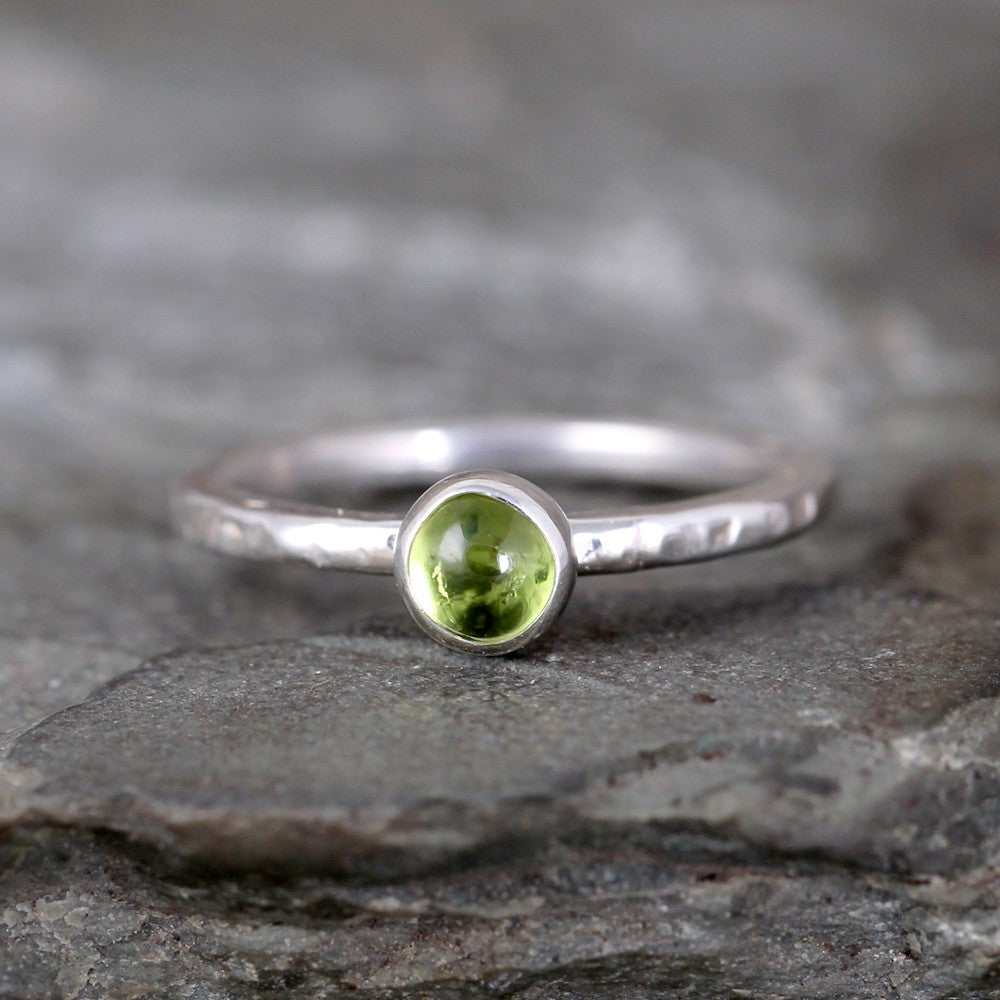 Genuine rich fresh spring green peridot gemstone set in sterling silver to stack or wear on its own. Handmade in my Calgary Alberta workshop each ring features a cabochon cut genuine peridot gemstone measuring approximately 5mm in diameter. My hand textured sterling silver band is approximately 2mm in width and will be sized for you to the size you select prior to shipping.