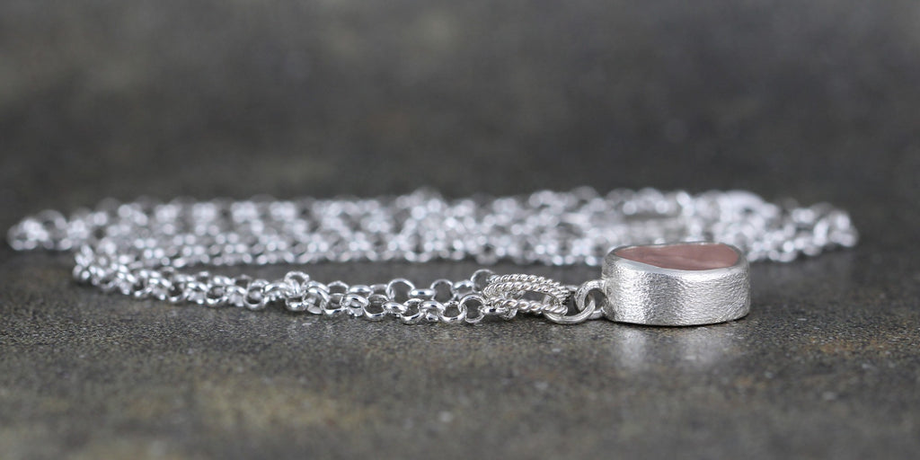Raw, uncut, rough light pink quartz is bezel set in textured sterling silver on this pendant. The pendant is topped by three twisted rings creating a unique connection to the rolo style chain it drops from. The pendant measures approximately 19mm from the top of the twist ring bail to the bottom of the setting and approximately 9mm in width. The chain is approximately 18" (45cm) in length, approximatley 2.8mm in width. The chain closes with a lobster style clasp.