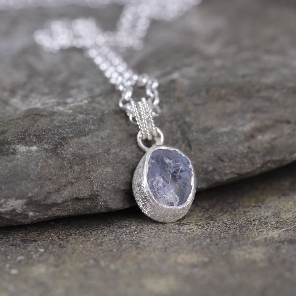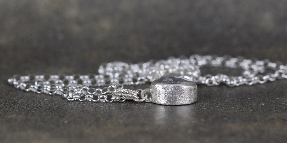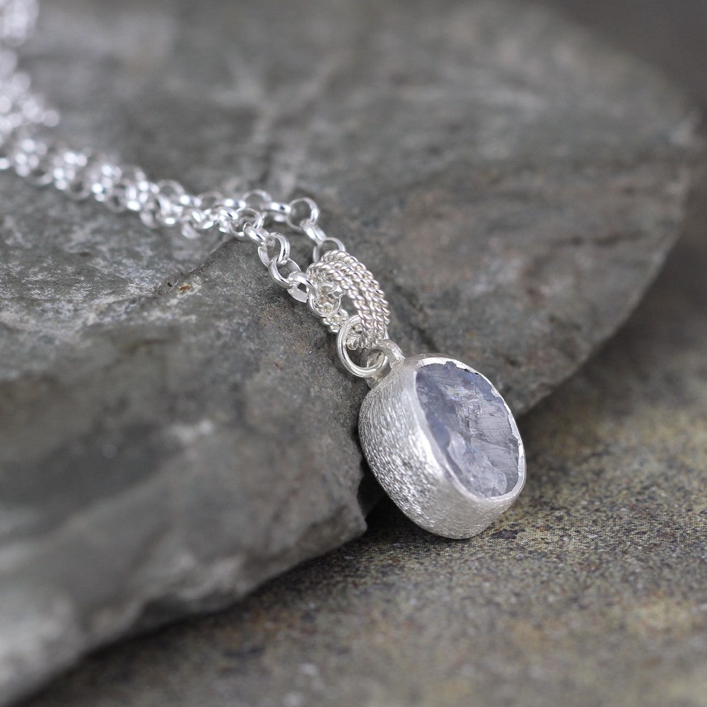 Raw, uncut, rough Moonstone is bezel set in textured sterling silver on this pendant. Moonstone has an interesting characteristic called 'play of color' that displays a shimmer and rainbow of color across the surface of the stone. This is seen in variations depending on the source and angle of the light. It is unique and interesting! The pendant is topped by three twisted rings creating a unique connection to the rolo style chain it drops from. The pendant measures approximately 19mm from the top of the twist ring bail to the bottom of the setting and approximately 9mm in width. The chain is approximately 18" (45cm) in length, approximately 2.8mm in width. The chain closes with a lobster style clasp.