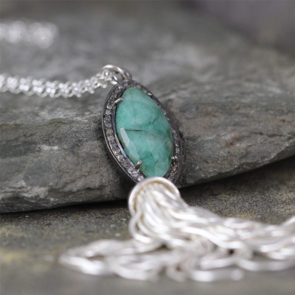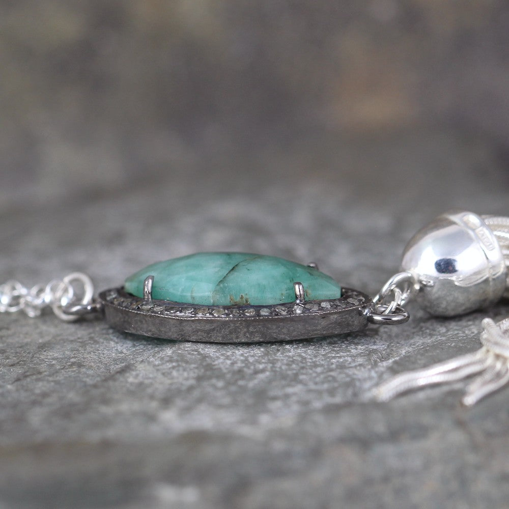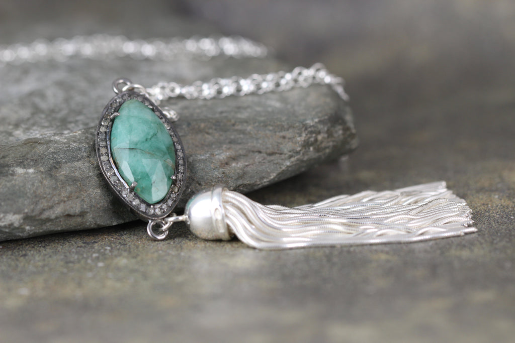 Raw Diamond & Emerald Tassel Necklace - Sterling Silver - Green Gemstone Pendant