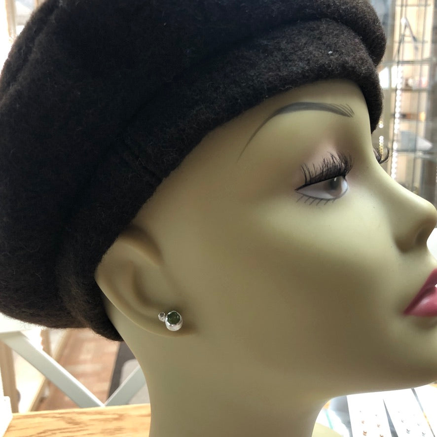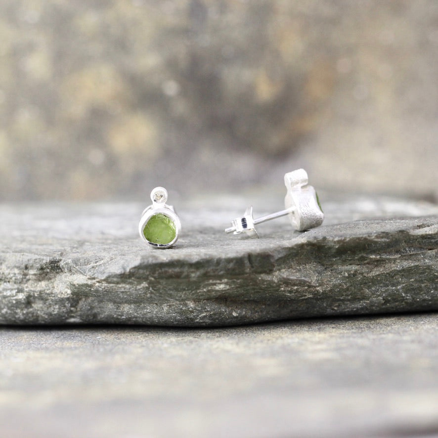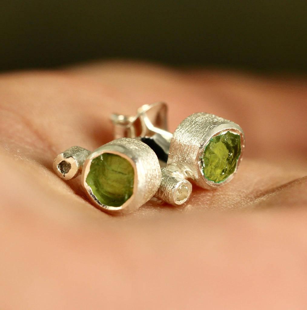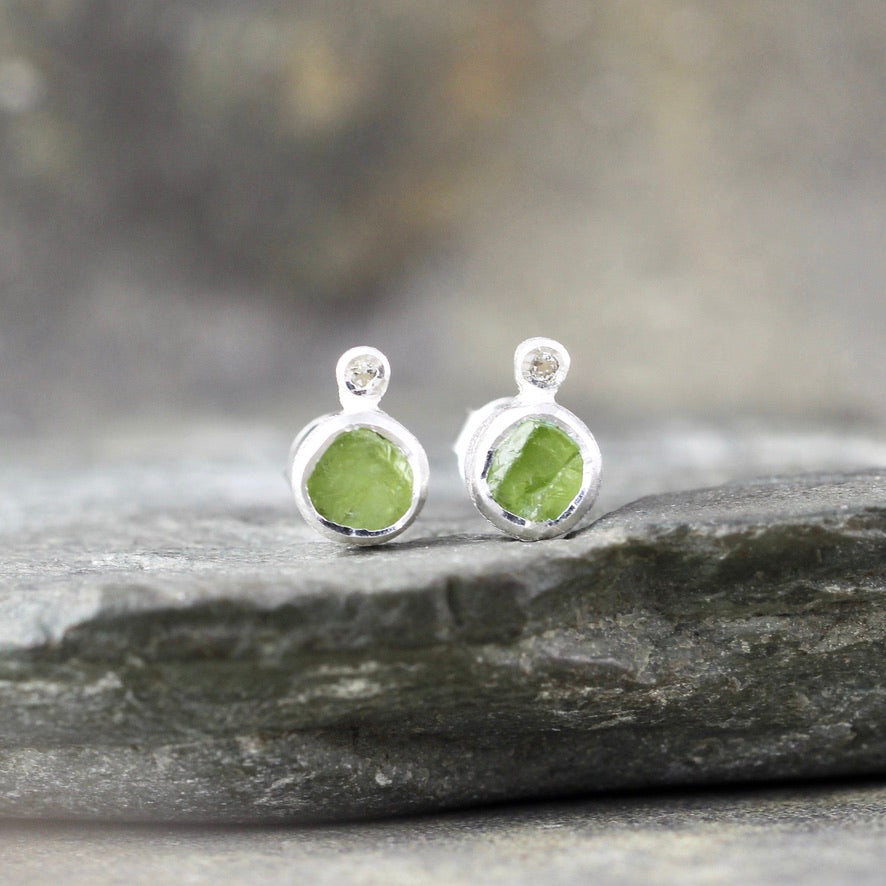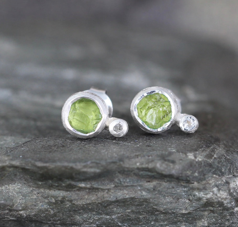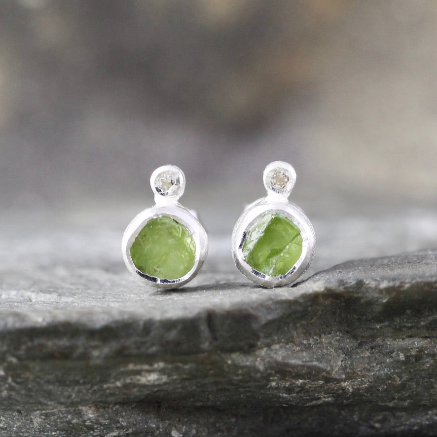 Fresh like new spring growth, genuine Peridot uncut gemstones accented by white topaz are set in textured sterling silver. These earrings have sterling silver posts and push on style backs. Each earring measures approximately 7.5 - 8mm in diameter. The peridot gemstones are natural, uncut, rough and raw...just as nature intended them to be.