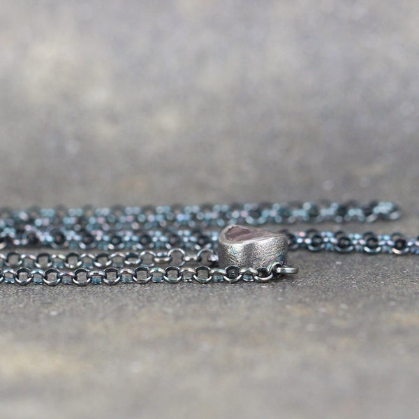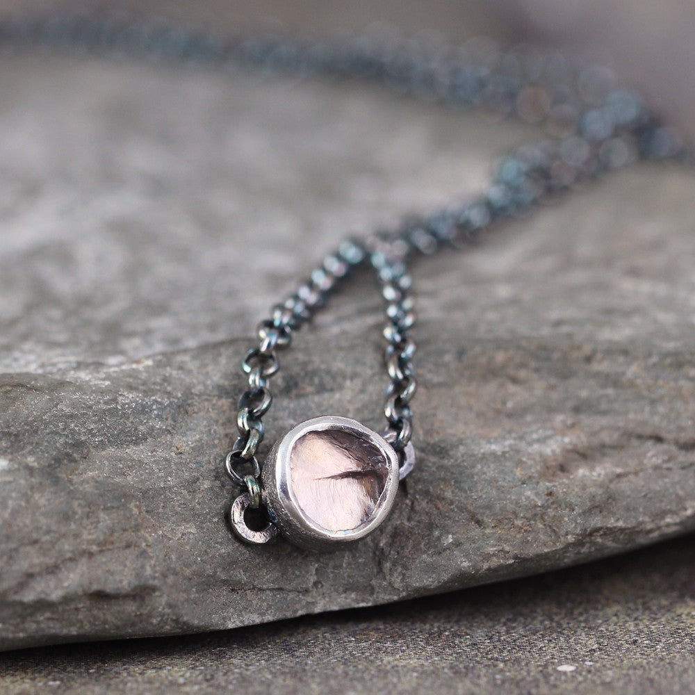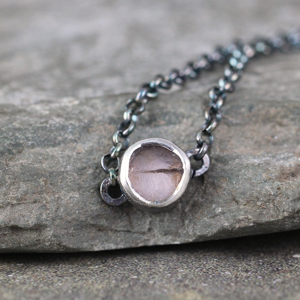 This modern bezel necklace features a rough, raw, uncut natural rose quartz gemstone. This easy to wear piece offers a pop of color perfect for layering or wearing on its own. The rustic pendant is centered on sterling silver rolo chain measuring approximately 18" and closing with a lobster style clasp. This necklace has been oxidized to accent the rustic style.