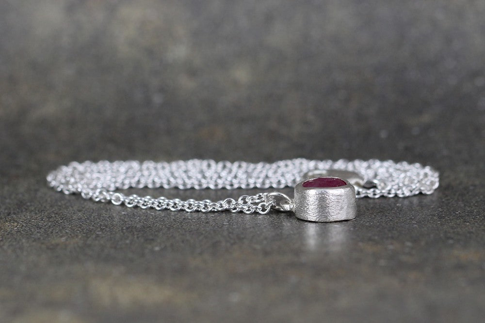 Cherry Red Ruby is bezel set in sterling silver and drops from a sterling silver chain. The rough, raw, uncut ruby is natural and the way nature created it. The pendant measures approximately 10mm from the top of the bail to the bottom of the rustic textured setting and approximately 7mm in width. The chain is approximately 18" (45cm) in length and closes with a lobster style clasp.