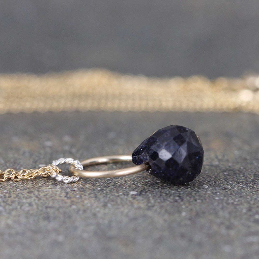 A stunning faceted briolette blue sapphire is the design focal of this modern style pendant. Created in 14K yellow gold filled and accented with sterling silver, this handmade pendant features a faceted richly colored blue sapphire measuring approximately 10mm in length. The overall length of the pendant is approximately 17.5 mm from the top of the sterling silver ring to the bottom of the sapphire gemstone. The handmade pendant hangs from a 14K yellow gold filled chain that measures approximately 18" (45cm) in length.