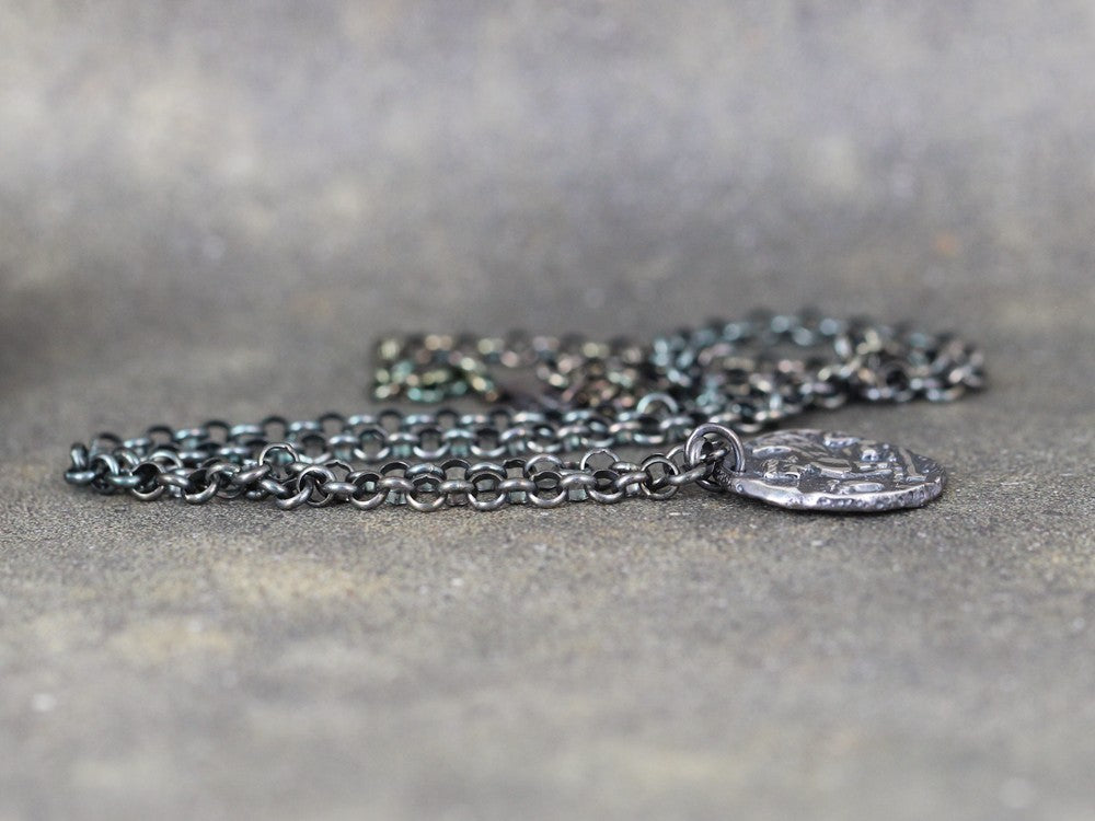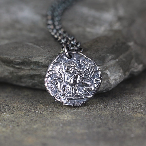 This sphinx pendant is made to replicate ancient Greek coins that depicted this mythological symbol. Made entirely in sterling silver, the rustic finish reflects ancient symbolism. The mythical sphinx pendant measures approximately 19mm in diameter and hangs from a sterling silver rolo link chain approximately 3mm in width and approximately 20" (50cm) in length. The chain closes securely with a lobster style clasp. The chain and pendant have been oxidized to accent the rustic patina of this piece.