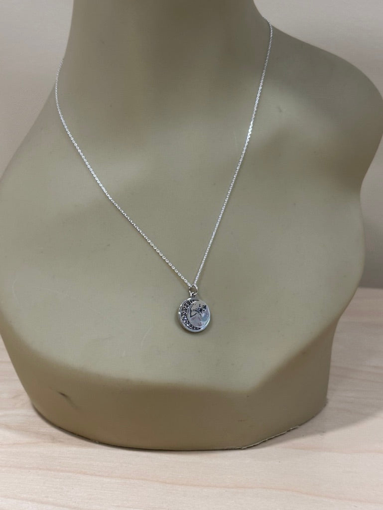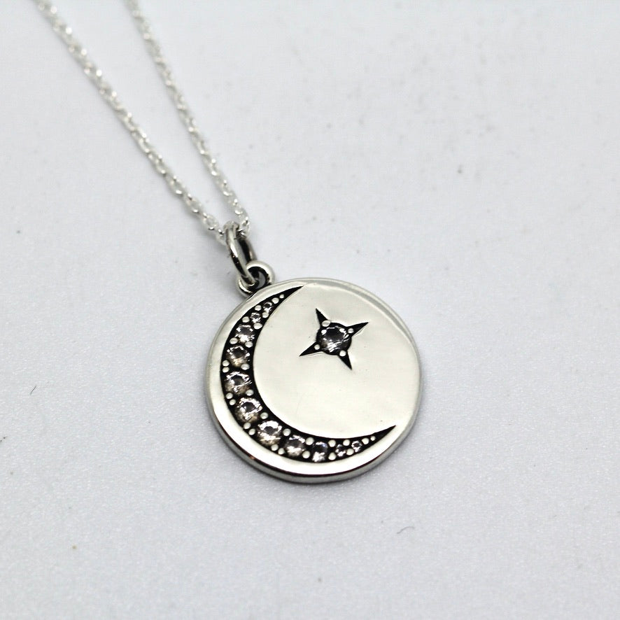 This pendant is crafted in polished sterling silver and accented with crystals representing the moon and a star. The pendant measures approximately 15mm in diameter. Included is a coordinating sterling silver chain approximately 18" in length. This style pendant is suitable for everyone!