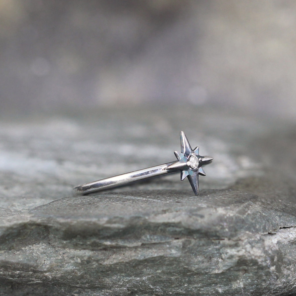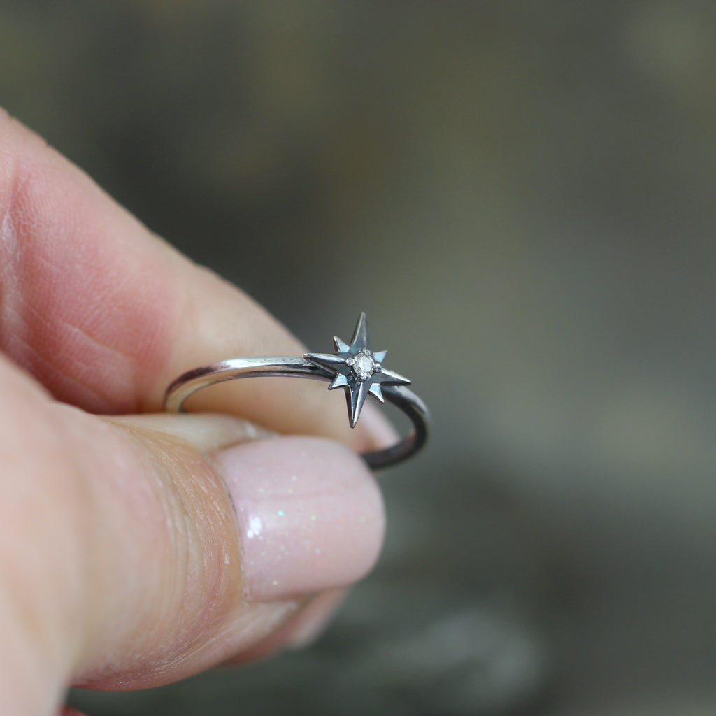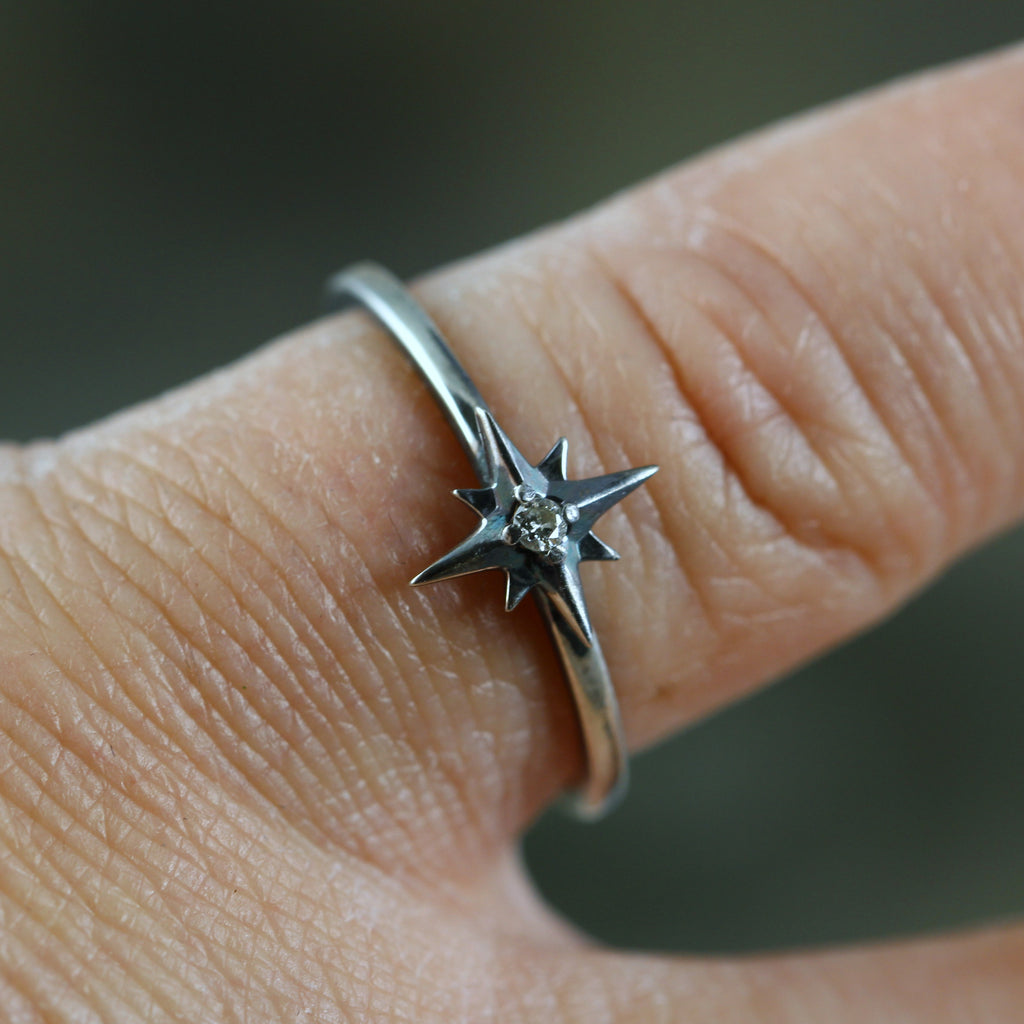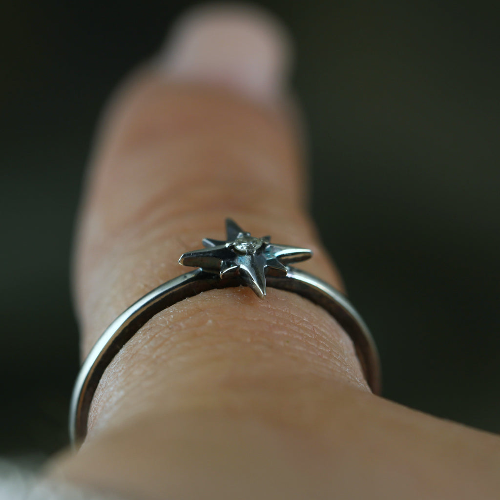 Twinkle twinkle with an adorable star ring! This ring is made in sterling silver and set with a genuine diamond approximately 0.02 carat. The width of the band is approximately 1.5mm. The top of the ring measures approximately 9mm from tip to tip. I've oxidized this ring to accent the details in the design. Your ring will be chosen from the selection I have made. Please expect slight variances due to handmade and natural gemstone characteristics.
