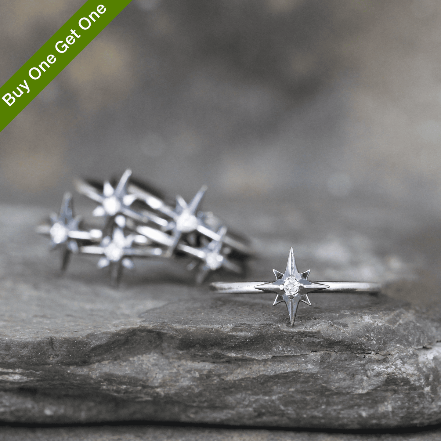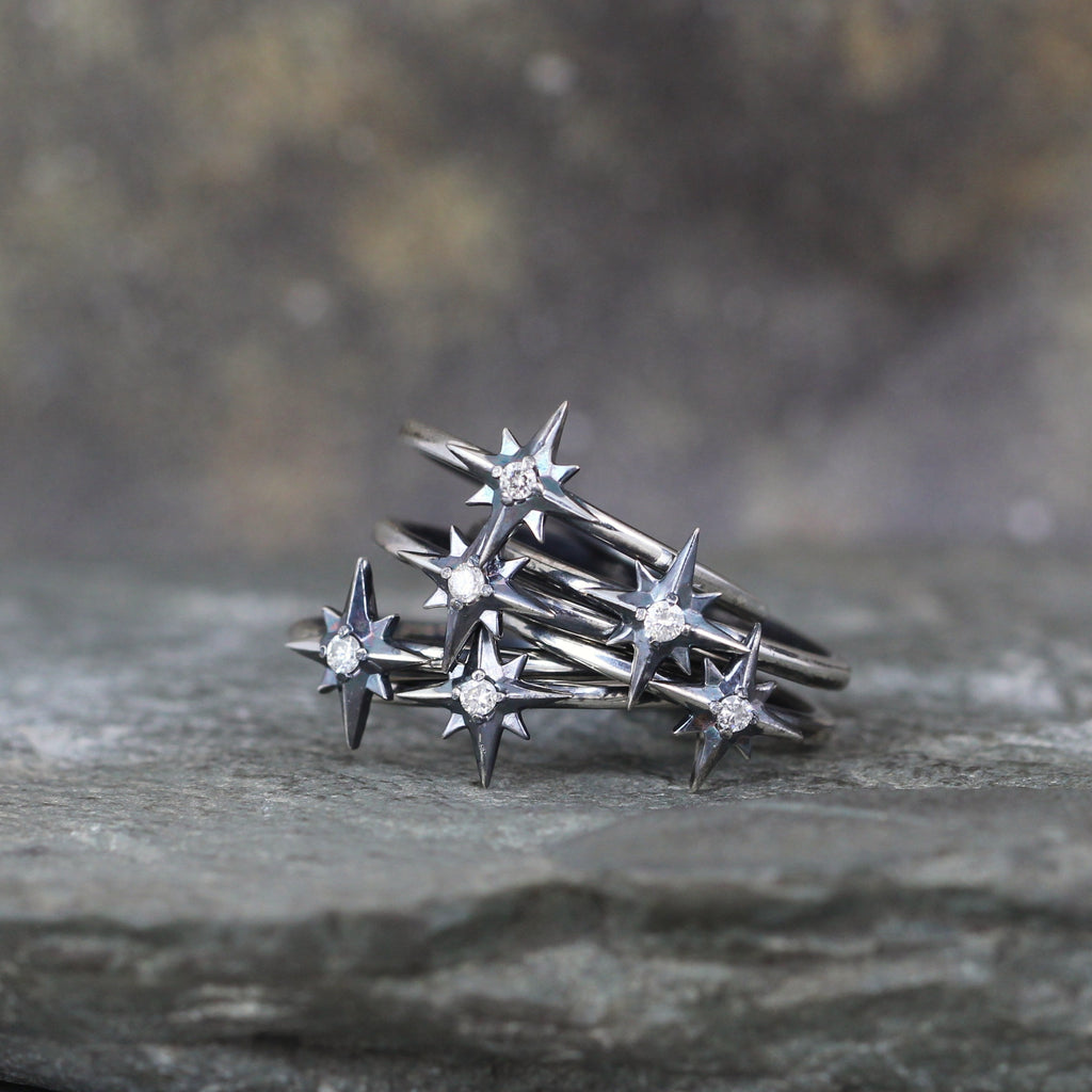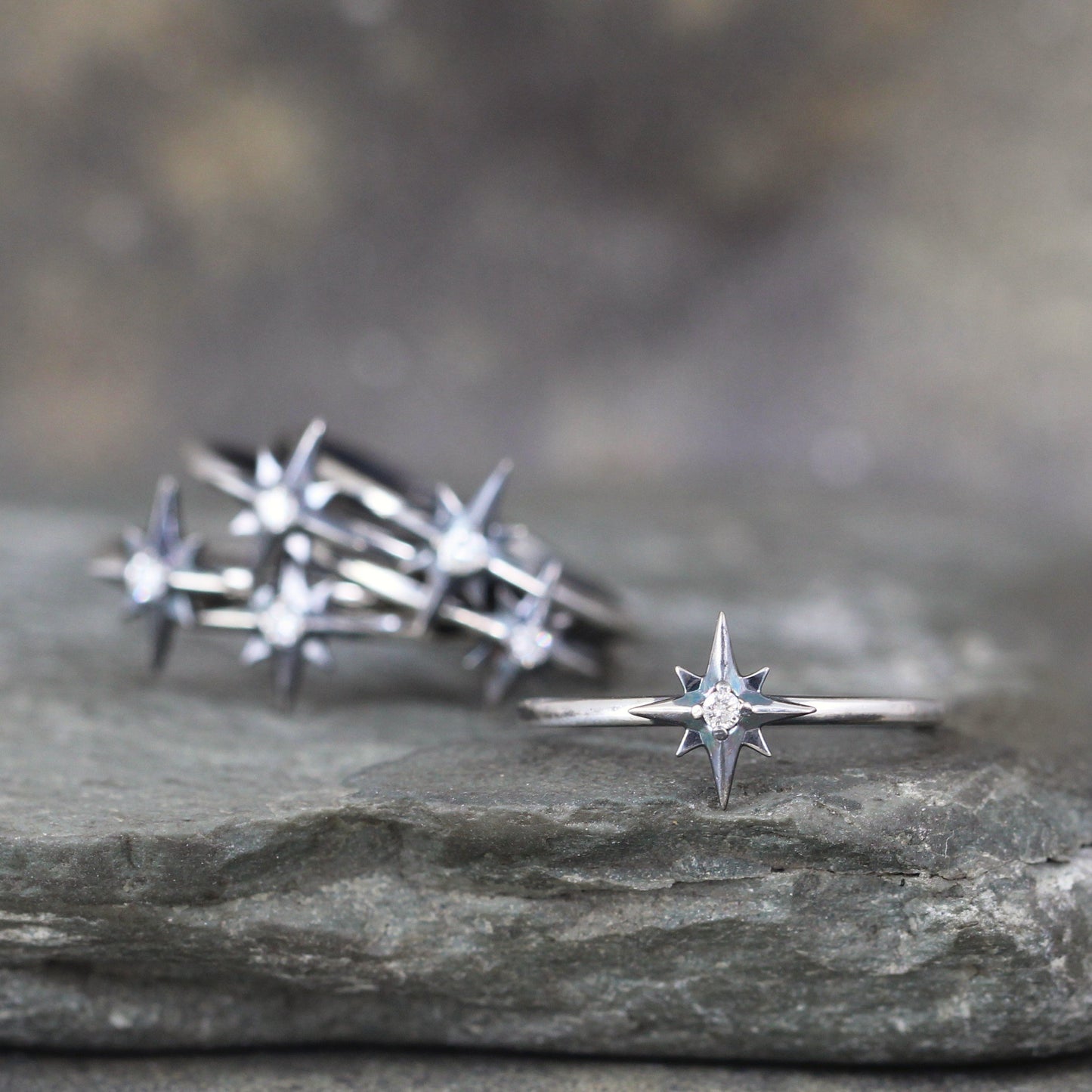 Twinkle twinkle with an adorable star ring! This ring is made in sterling silver and set with a genuine diamond approximately 0.02 carat. The width of the band is approximately 1.5mm. The top of the ring measures approximately 9mm from tip to tip. I've oxidized this ring to accent the details in the design. Your ring will be chosen from the selection I have made. Please expect slight variances due to handmade and natural gemstone characteristics.