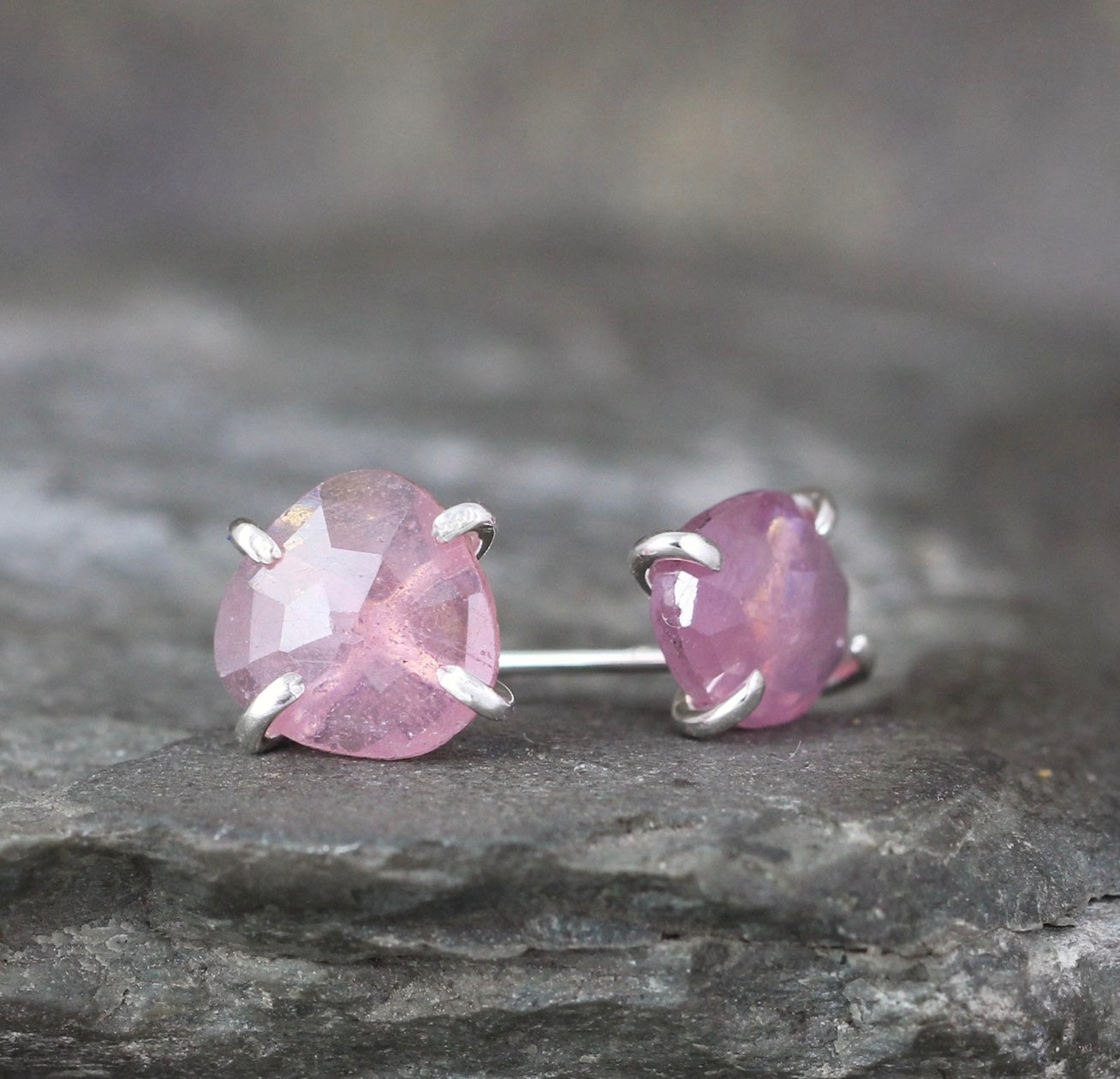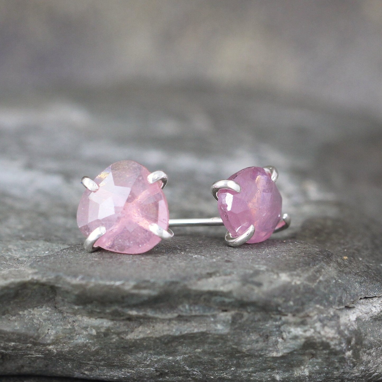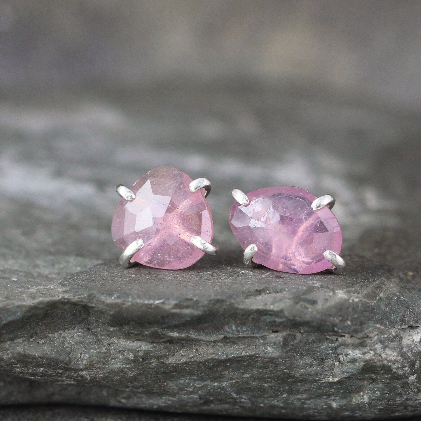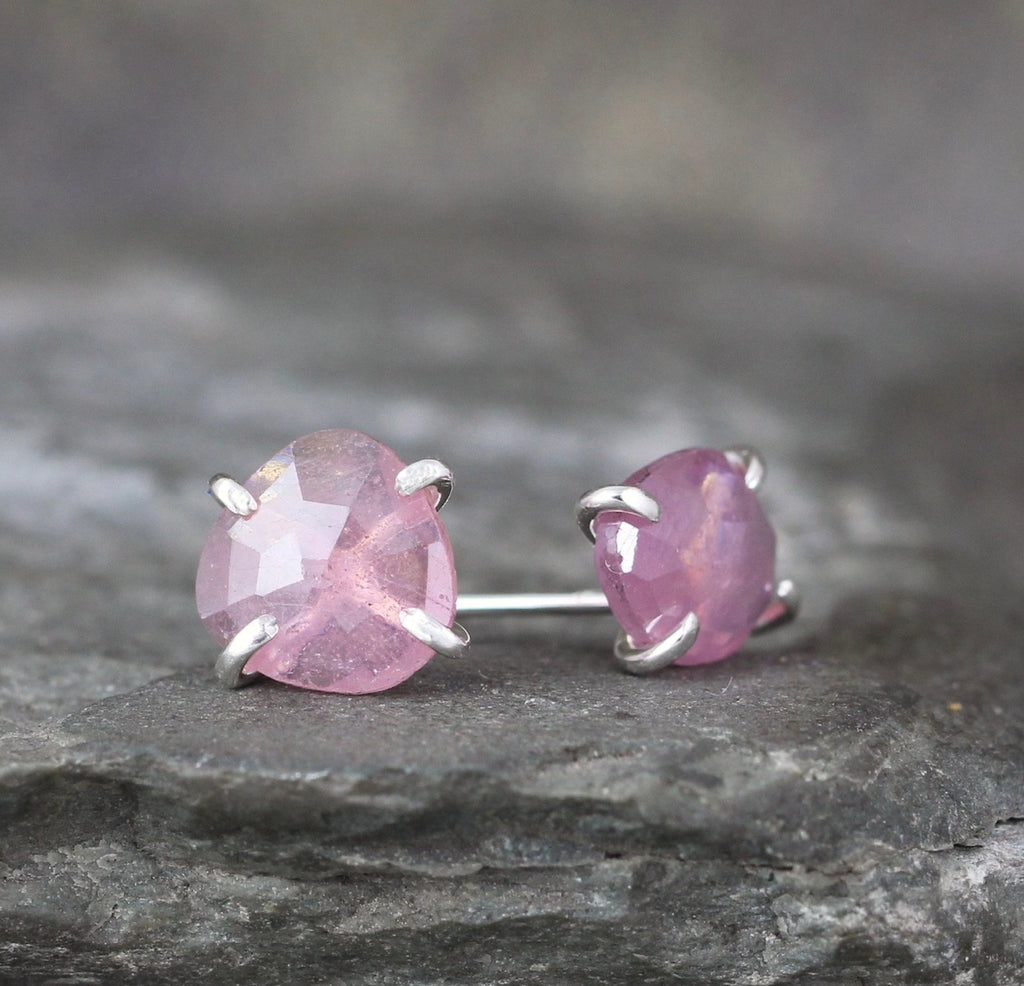 Pretty pink color rose cut sapphires in a free form shape are set in handmade sterling silver earring settings. These earrings add a subtle pop of color to your ears and the perfectly imperfect shape will take you from casual to formal and everything in between. The rose cut style is a very old style of cutting and polishing gemstones...the pattern created by the facets is reminiscent of the petals of a rose, hence the name 'rose cut'. These earrings measure approximately 8mm x 10mm and have a shimmer and shine not easily captured in the photos. The stud style earrings come complete with push on style backs (not shown in the photos).