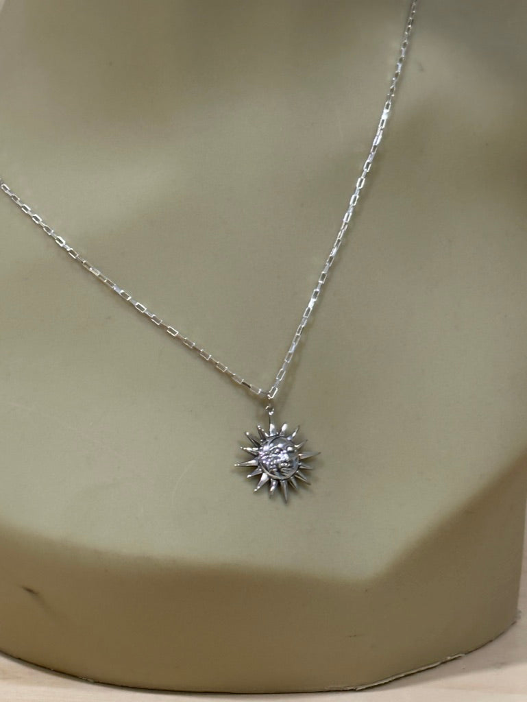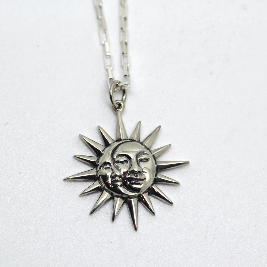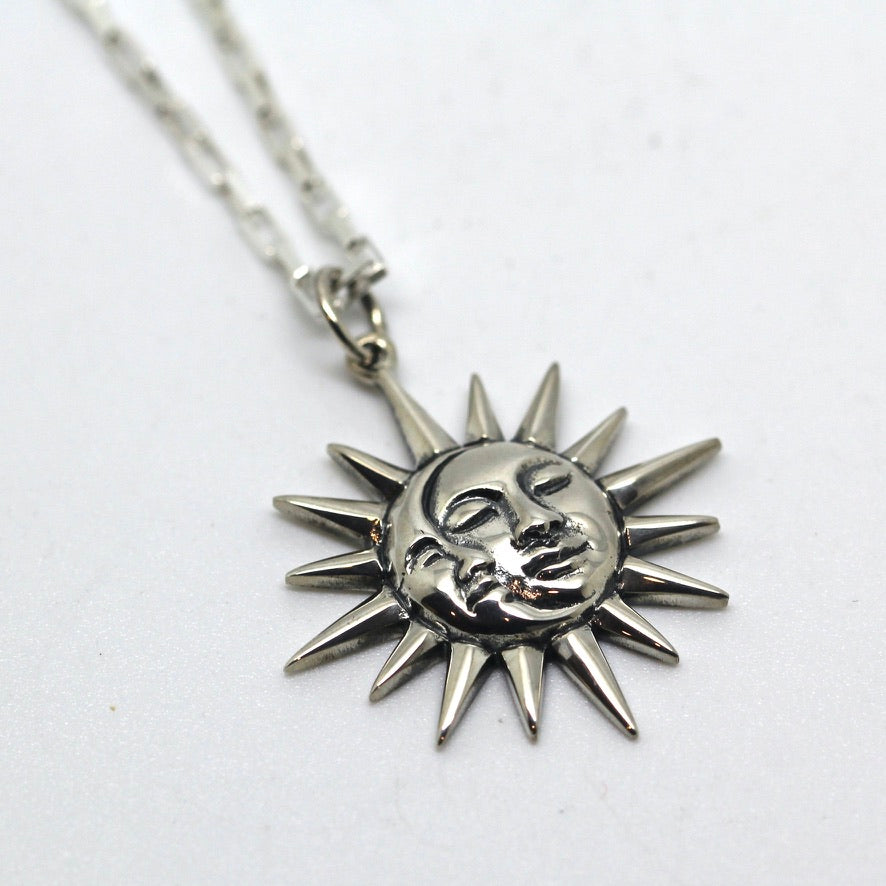 Night and day and our universe is represented in this full sun and crescent moon necklace. The pendant measures approximately 22mm in diameter. Included is a coordinating sterling silver chain approximately 20" in length. This style pendant is suitable for everyone!