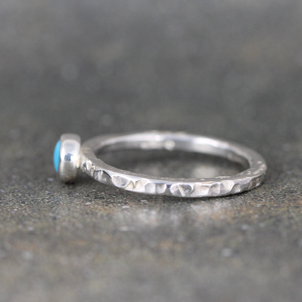 Genuine turquoise gemstone set in sterling silver to stack or wear on its own. Handmade in my Calgary Alberta workshop each ring features a cabochon cut genuine turquoise gemstone measuring approximately 5mm in diameter. My hand textured sterling silver band is approximately 2mm in width and will be sized for you to the size you select prior to shipping.