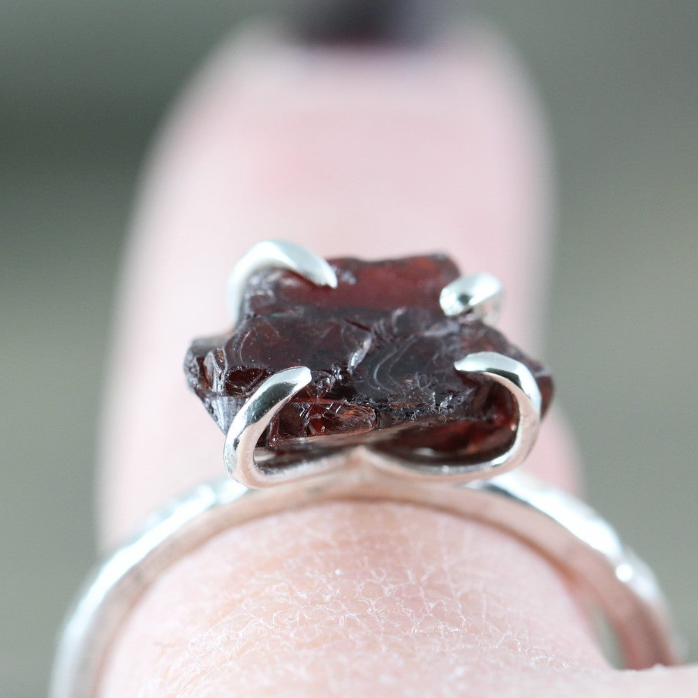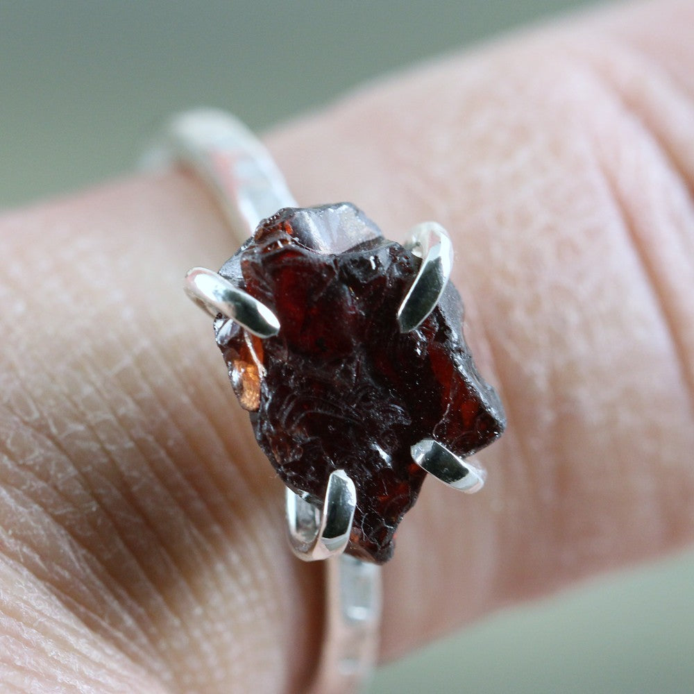 Genuine, rough and uncut, rich deep red garnet gemstone set in sterling silver to stack or wear on its own. Handmade in my Calgary Alberta workshop each ring features a natural uncut raw genuine garnet gemstone measuring approximately 7.5mm x 11mm. My hand textured sterling silver band is approximately 2mm in width and will be sized for you to the size you select prior to shipping.