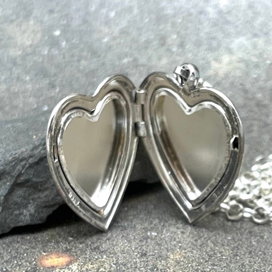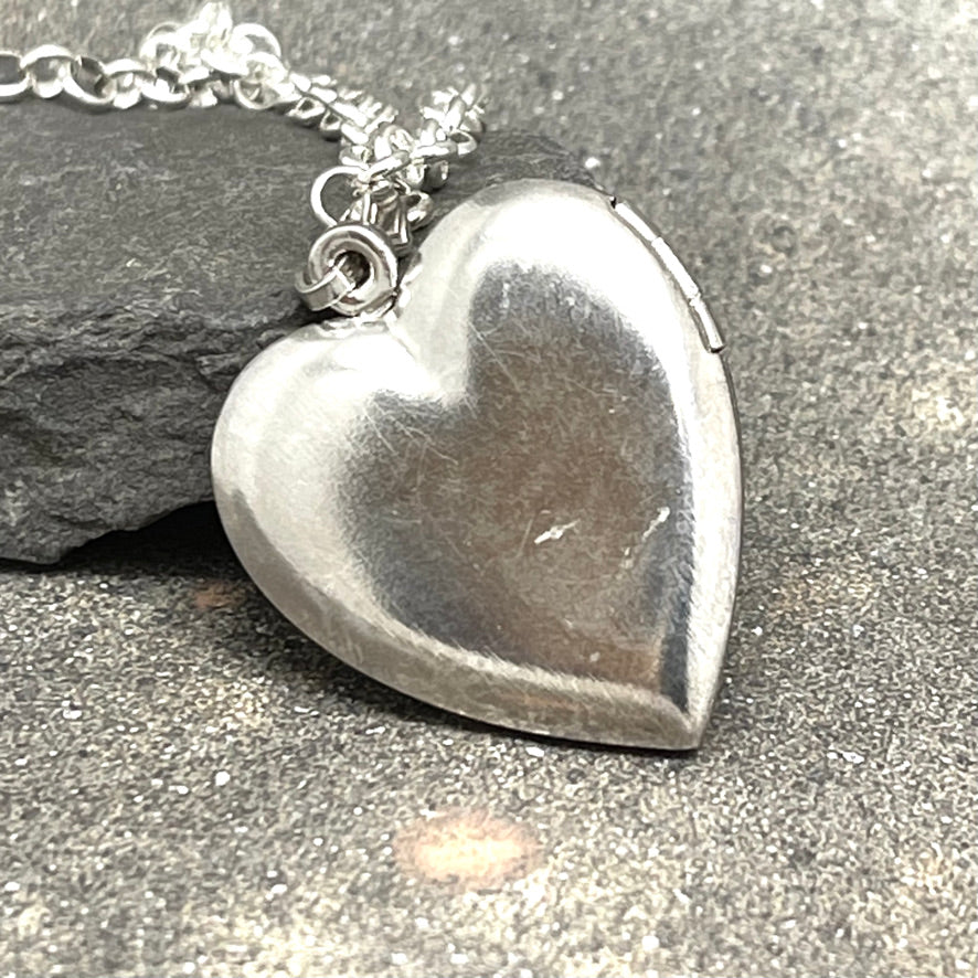 Darling vintage heart shape locket complete with beautiful engraved detailing on the front.  The locket opens for photos, mementos and memories.    The locket measures approximately 25 mm long and approximately 23mm wide.   There are some age related marks on this piece as shown in the photos that do not affect its beauty or durability.   Variances and marks on vintage pieces are a testament to the authenticity of the age.   The sturdy rolo style link chain measures approximately 24" in length and closes with a lobster style clasp.